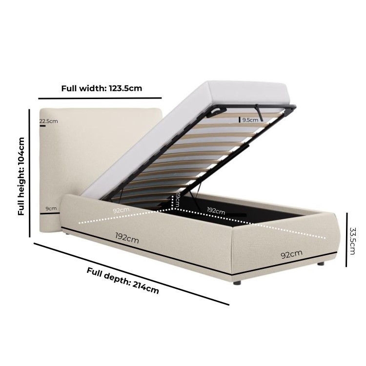 Add a touch of luxury to any bedroom with Dune ottoman bed. Crafted with comfort in mind, the sumptuously cushioned pillow headboard creates a plush and comfortable sleeping experience for those who value both style and comfort. Its neutral beige colour complements any bedroom decor. The bed has a space-saving ottoman base perfect for linens, towels or seasonal clothing storage. The end-opening gas-lift mechanism allows you to access the generous storage space easily. It's sprung-slatted for ultimate comfort and fits a UK standard single-size mattress.