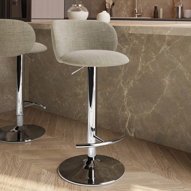 The Tessa beige woven adjustable barstool is the perfect combination of style, comfort, and practicality. Its woven textured fabric upholstery brings a natural yet chic vibe to your kitchen or bar area, while the chrome leg adds a modern edge. Designed for adaptability, this barstool features an adjustable height mechanism and a smooth 360-degree swivel, making it ideal for a variety of settings and uses.