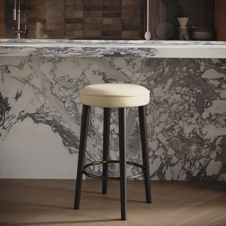 The Gatsby Counter Stool blends modern elegance with everyday comfort, making it a standout addition to any kitchen or breakfast bar. Upholstered in a soft beige chenille fabric, the thick, cushioned seat offers a plush and inviting feel that enhances both style and comfort. The sleek black tapered legs introduce a contemporary edge, while the brass footrest adds a touch of elegance. Chic, stylish, and versatile, the Gatsby stool elevates your space with its refined design and effortless charm.