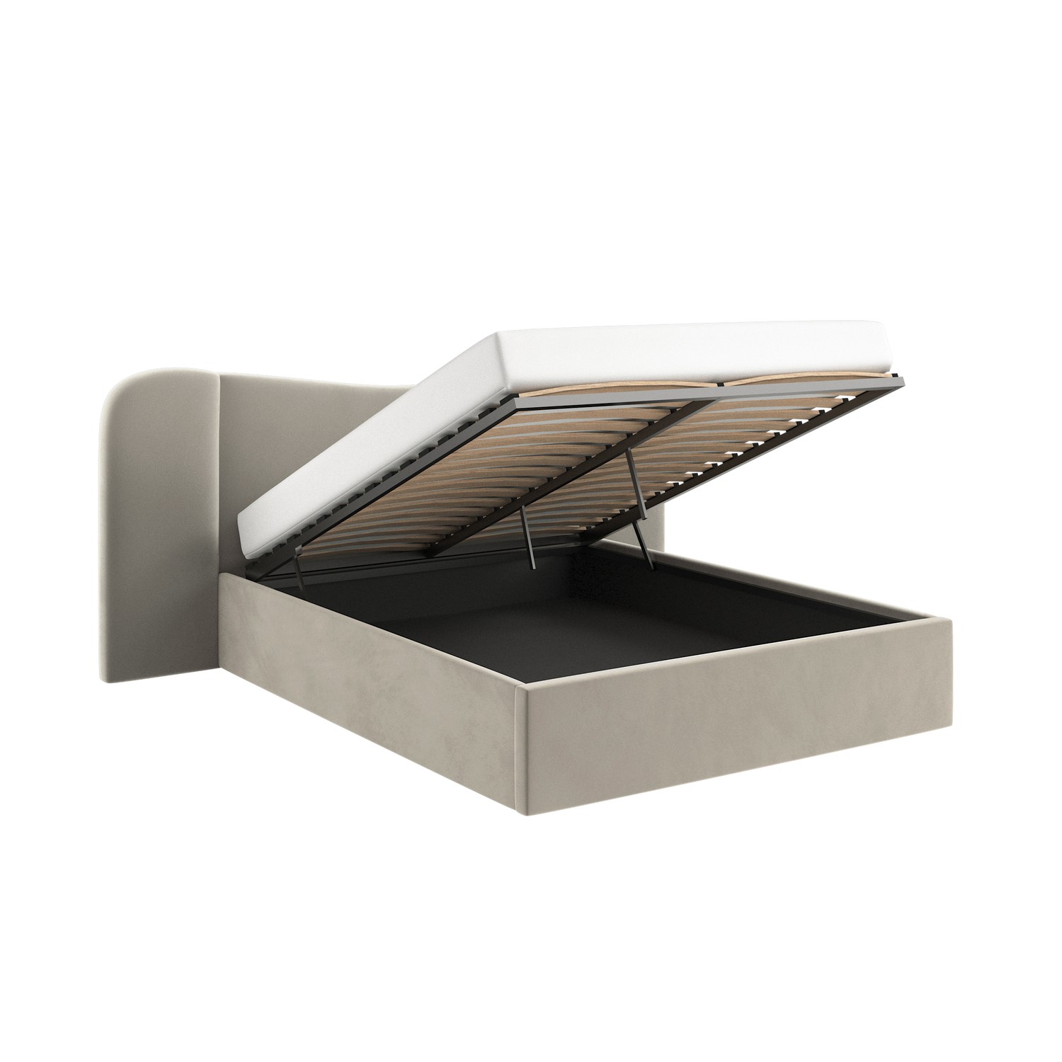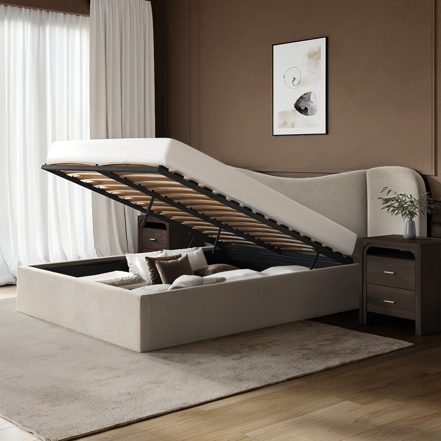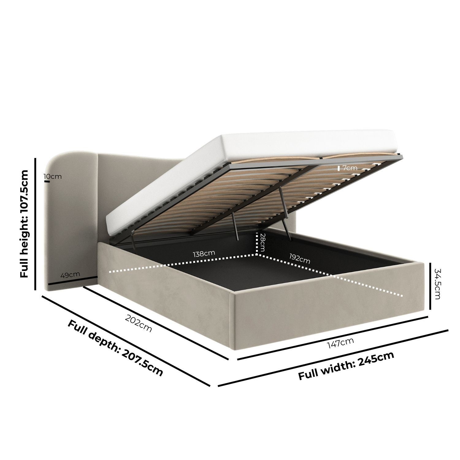The Samara Ottoman Bed is a stylish blend of contemporary design and functionality. Upholstered in sumptuous, soft-touch beige velvet fabric, Samara exudes a luxury hotel- style bed with a plush, curved, wide headboard that not only adds a touch of sophistication to any bedroom but also provides added comfort for sitting or lounging in bed. The end-opening gas-lift mechanism allows you to access the generous fabric-lined storage space effortlessly. It features a sprung slatted base for comfortable mattress support, ensuring a great night's sleep. This bed fits a UK standard double-size mattress.