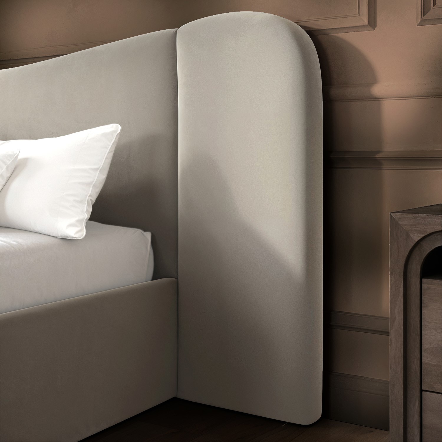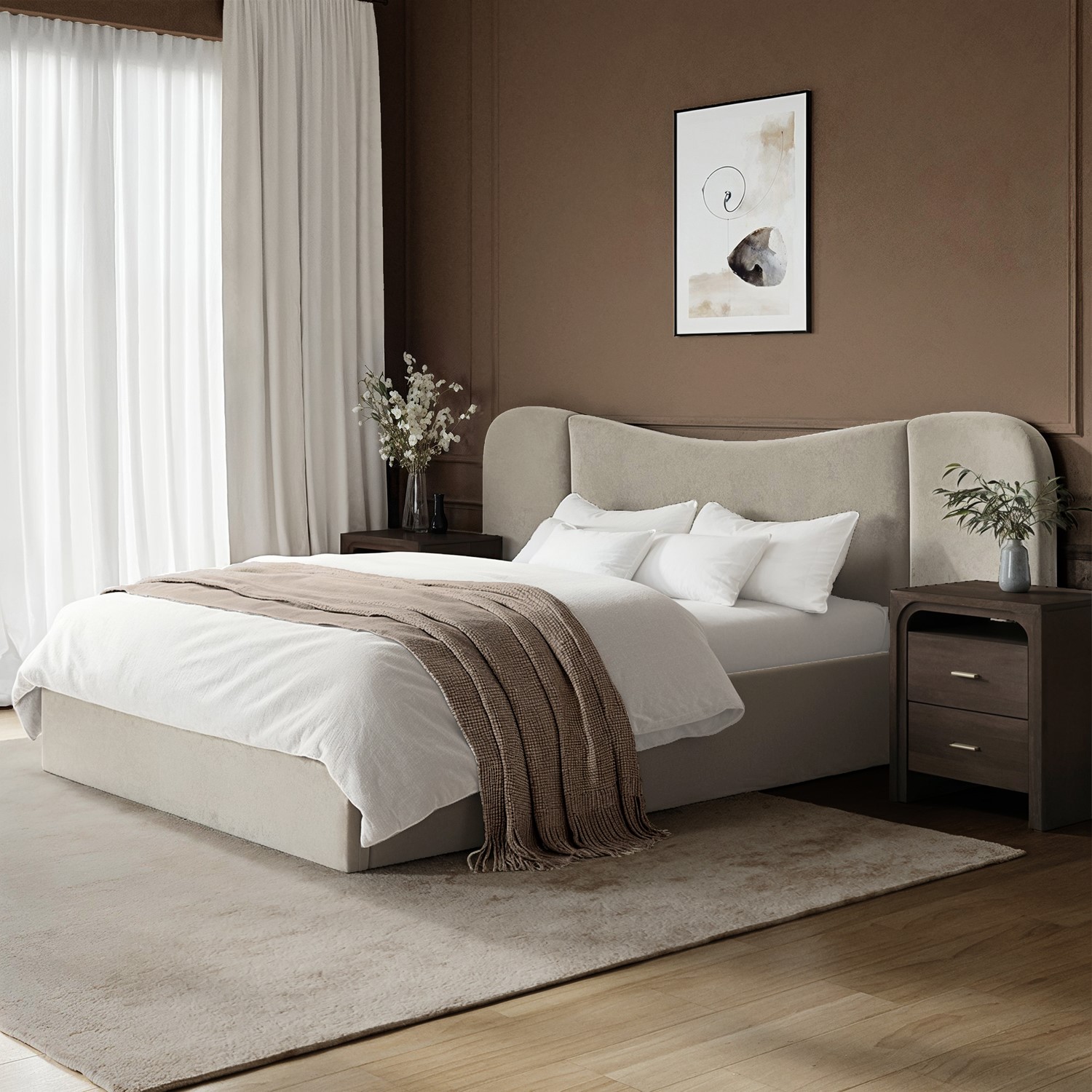 Plush, Curved, Wide Headboard: The plush, curved, wide headboard gives your bedroom a modern and sophisticated look.