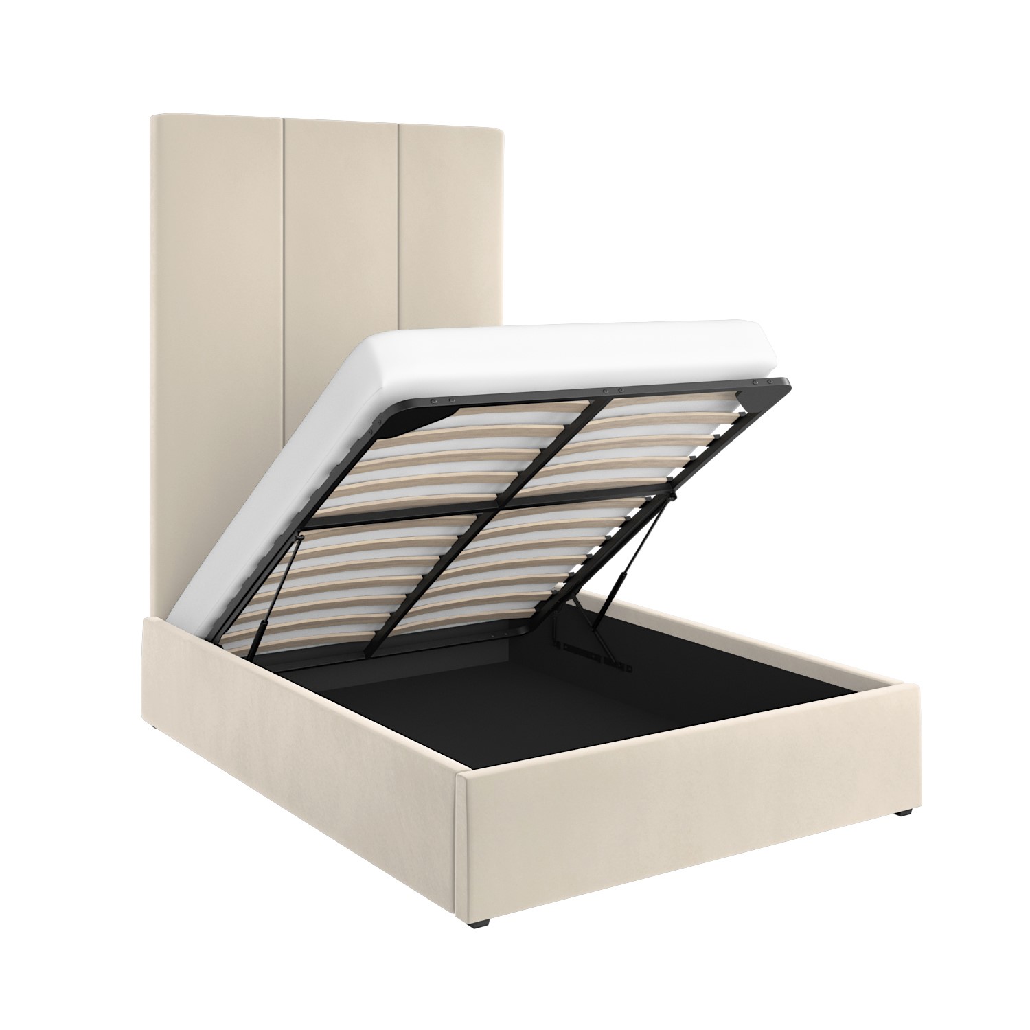 The Alisha double ottoman bed with extra-tall panelled headboard perfectly blends comfort and style. The headboard on this luxury bed is padded for ultimate comfort and can be arranged vertically or horizontally. The ottoman storage feature offers plenty of space to store your clothes and bedding, supported by a solid storage base for added durability. It is upholstered in luxuriously soft beige velvet fabric and has a wooden sprung-slatted base for sturdy mattress support.