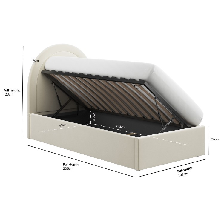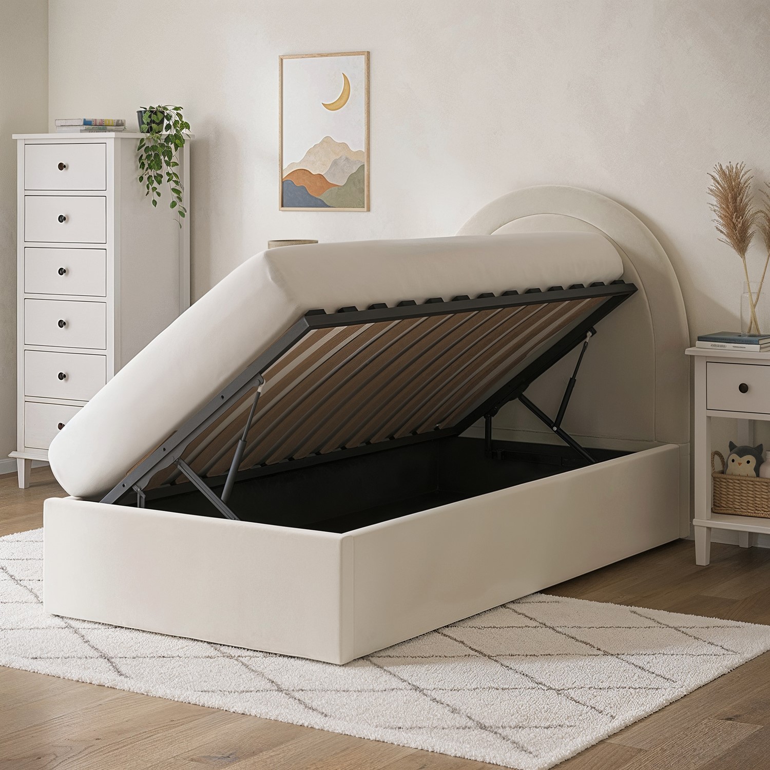 Create an instant focal point with the Nora single ottoman bed. It's beautifully upholstered in soft and luxurious cream velvet fabric to suit any bedroom decor, and the arched headboard makes it a real statement piece. The side-opening ottoman storage features a gas-lift mechanism and is perfect for storing extra bedding and out-of-season clothes. The hardwood frame and sprung-slatted base provide sturdy mattress support. This bed fits a UK standard single-size mattress, which can be purchased with a 10% discount when bought with this bed - see our package deals below.