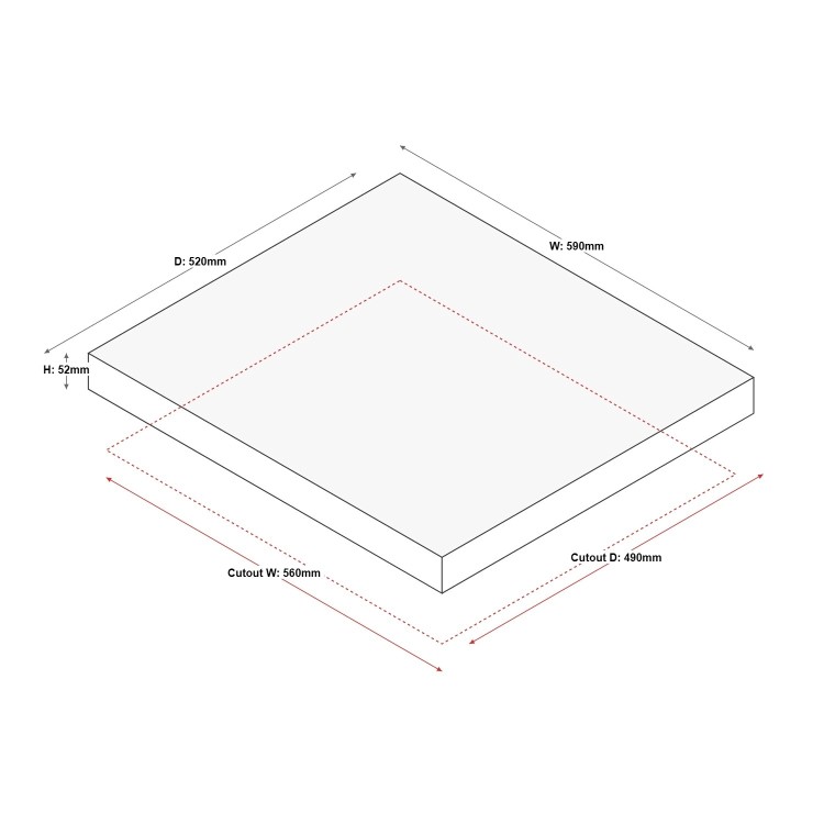 Hi, The Beko 58cm 4-Zone Induction Hob (model HII64201MT) requires a cut-out opening of 560?mm in width and 490?mm in depth for proper installation.