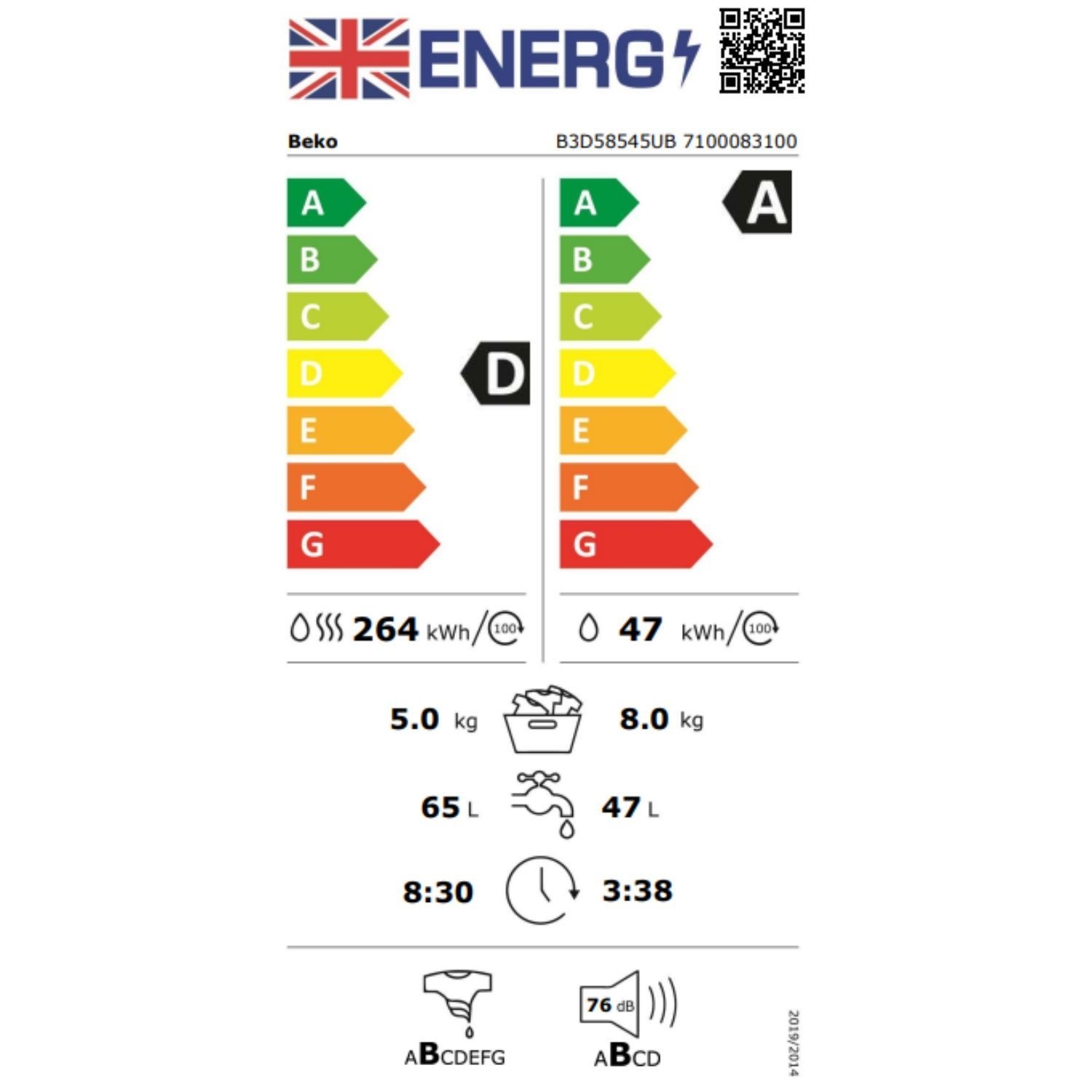 The Beko bPro500 B3D58545U washer dryer makes laundry simple. With an 8kg wash and 5kg dry capacity, it easily handles clothes for busy homes, meaning fewer loads for you. You can control this smart washer dryer from your phone using Wi-Fi*, letting you start or stop cycles from anywhere. This quiet, energy-efficient machine helps you save on bills and runs without disturbing your home. Its clever Sensor Drying stops clothes from over-drying, saving energy and keeping them in good condition.