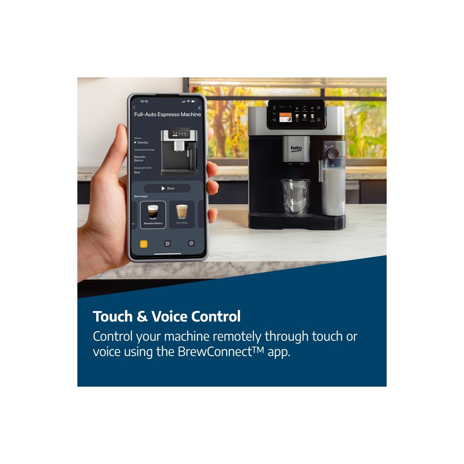 Customise your coffee wherever you are with the Beko connected app. Adjust drink size, strength, or temperature remotely – or use voice control for hands-free convenience.