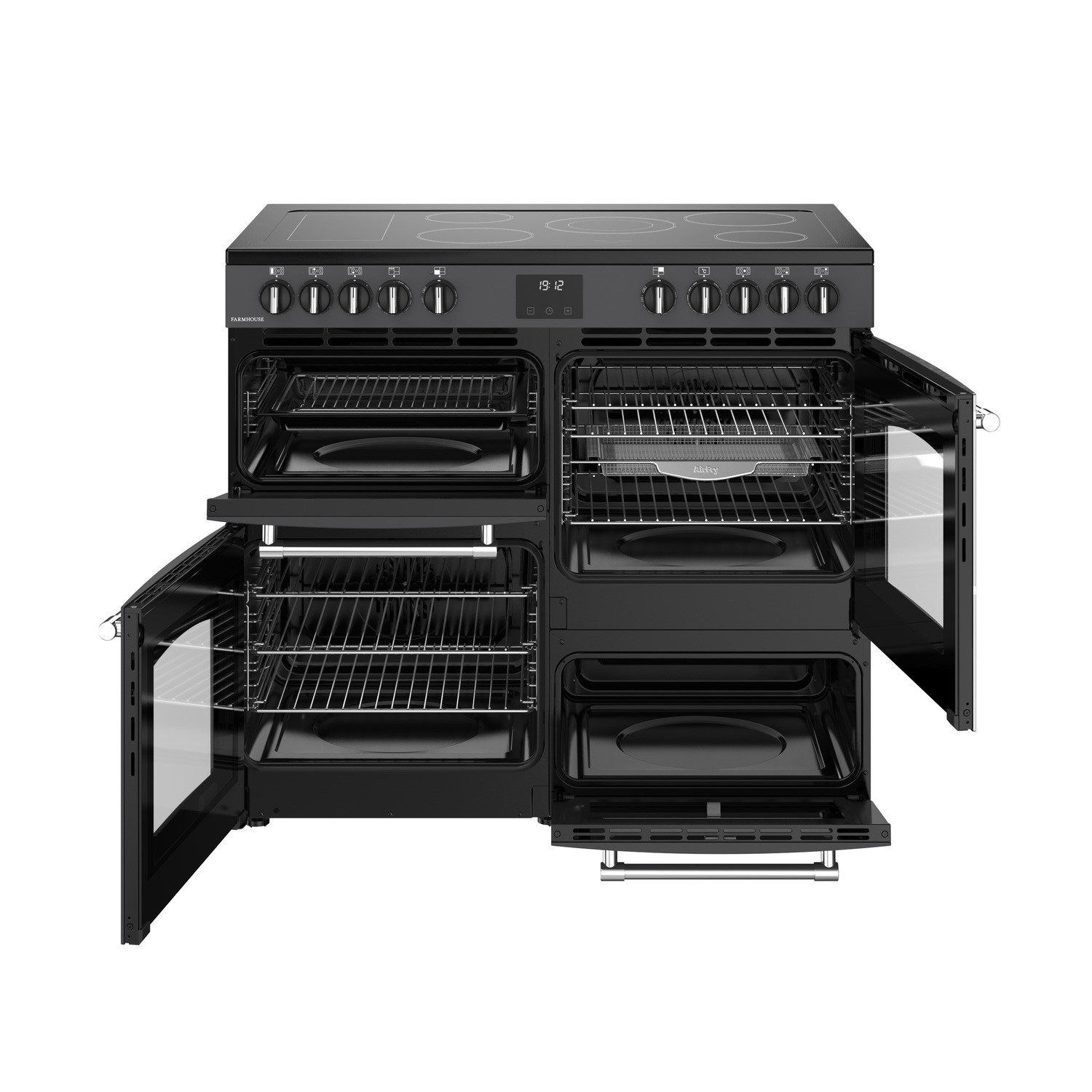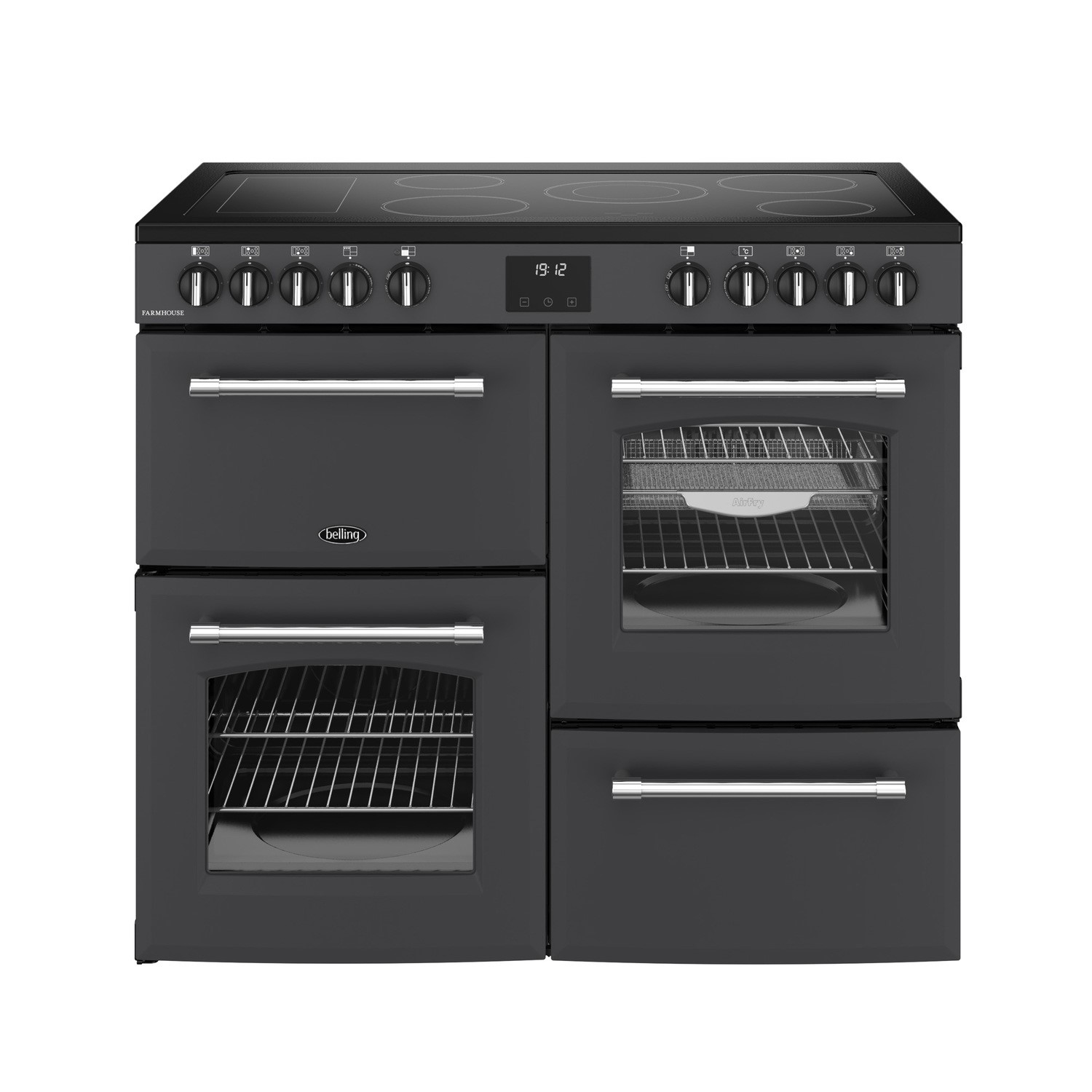 Belling range cookers have been at the heart of UK homes for more than a century, and they’ll be there for you for many years to come. This all-electric model features electric ovens with a 5-zone ceramic hob plus a warming zone and at 100cm wide, this mid-size range cooker will fit right into kitchens of all sizes. Underneath its sleek, contemporary finish, there’s 157 litres of cooking capacity and a host of features designed to make cooking simple. You can choose between two electric ovens: a conventional electric second oven, and the fanned main electric oven with a variety of different functions. This includes the AirFry function and tray, which puts all the time-saving benefits of this appliance back into your oven (freeing up space on your countertop.)