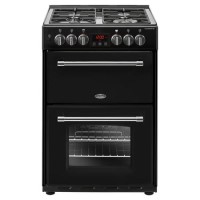 This 60cm dual fuel mini range cooker with double oven offers 4 gas burners with cast iron pan supports, a large touch control LED clock/programmable timer, rotary controls & easy clean enamel.