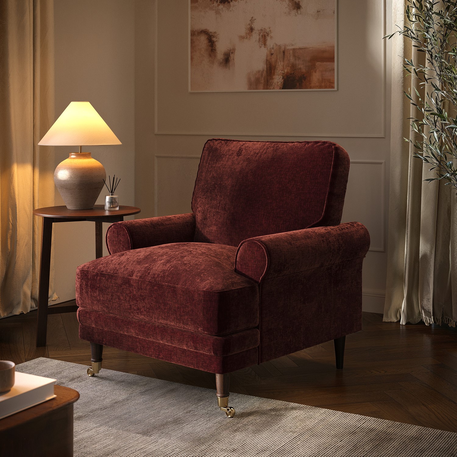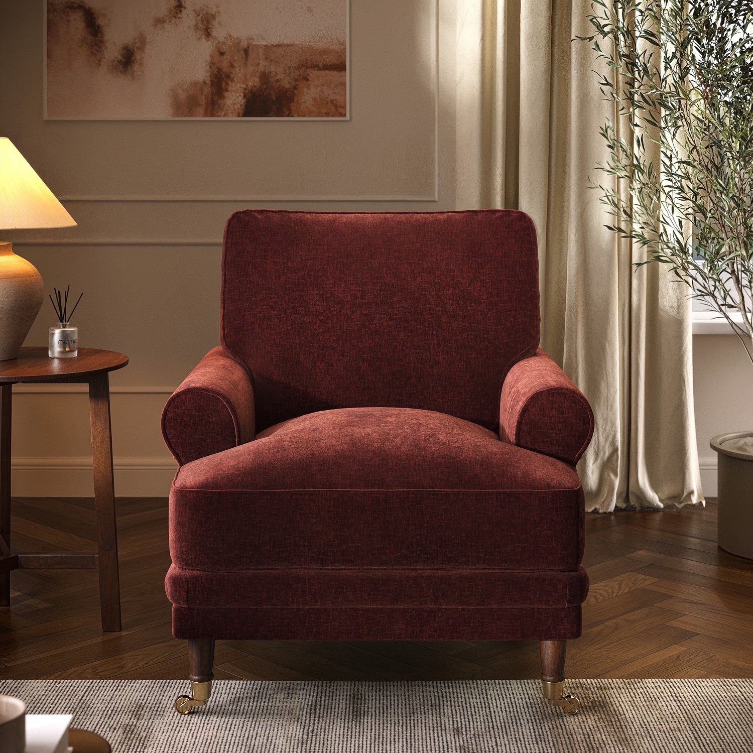 Experience refined comfort with the Payton Heritage Armchair, a timeless update of our beloved classic. Its elegant scrolled arms, tiered border, and rich berry-brown chenille upholstery bring warmth and sophistication to any home. Generous feather-filled cushions offer cloud-like softness and support, making it a perfect reading chair or stylish accent piece. Removable cushions keep cleaning and maintenance easy, allowing the Payton armchair to withstand everyday use while retaining its timeless beauty, offering lasting comfort and style for many years.