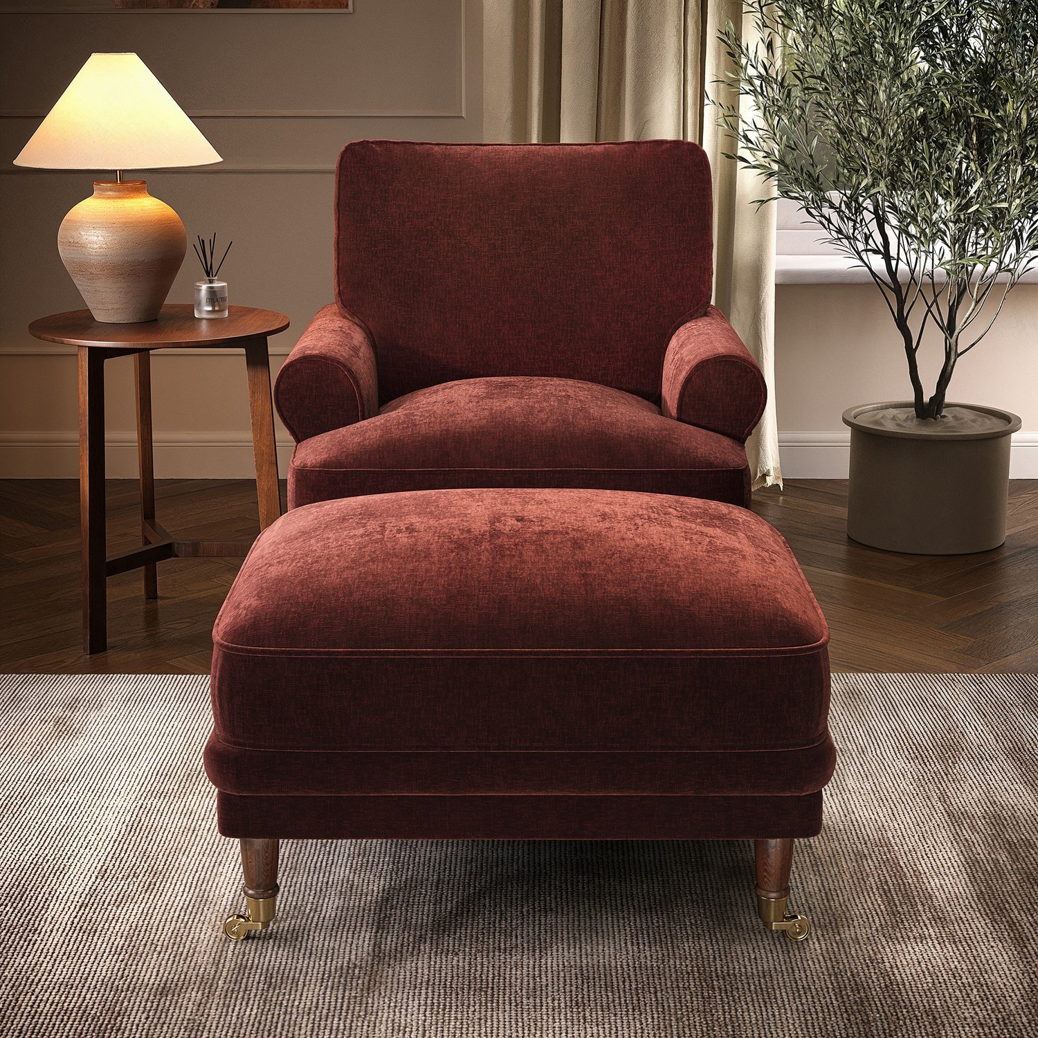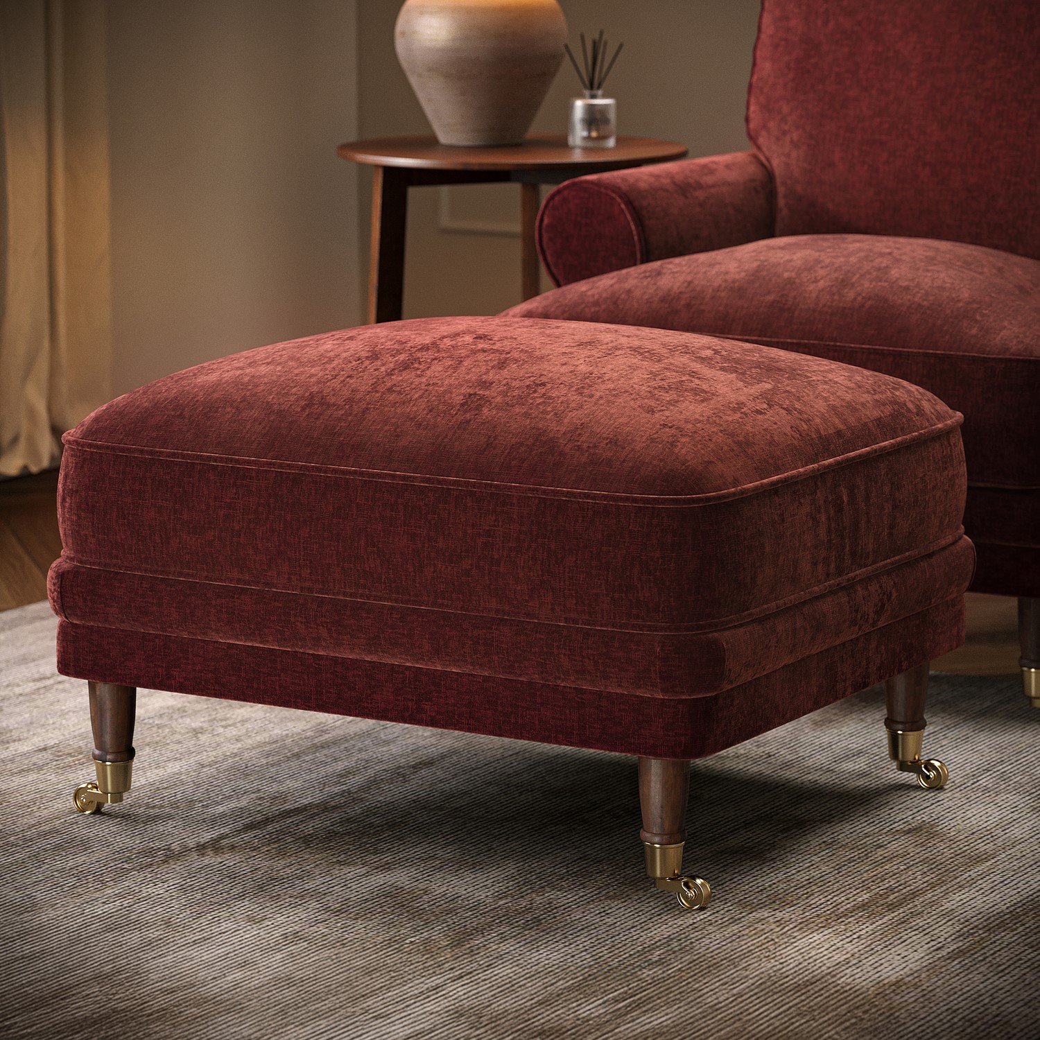 Experience refined comfort with the Payton Heritage Footstool, a timeless update of our beloved classic. Perfectly designed to complement the Payton Heritage sofa or armchair, it creates a cohesive and sophisticated look in any room. Generously padded with premium feather filling, it offers a soft, inviting feel, ideal for stretching out and relaxing after a long day. Wrapped in rich berry-brown chenille with a textured finish, it adds warmth, depth, and understated elegance to your home. Versatile and multi-functional, it can be used as a footstool, extra seating, or a small coffee table. Thoughtful details like removable castors and a fully finished 360-degree design ensure both practicality and style.