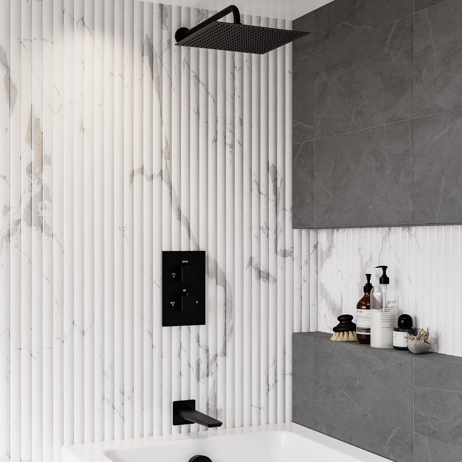Dual Outlet Functionality: Equipped with a diverter, this concealed valve allows you to effortlessly switch between two water outlets: the overhead shower with wall arm, and a bath filler spout.