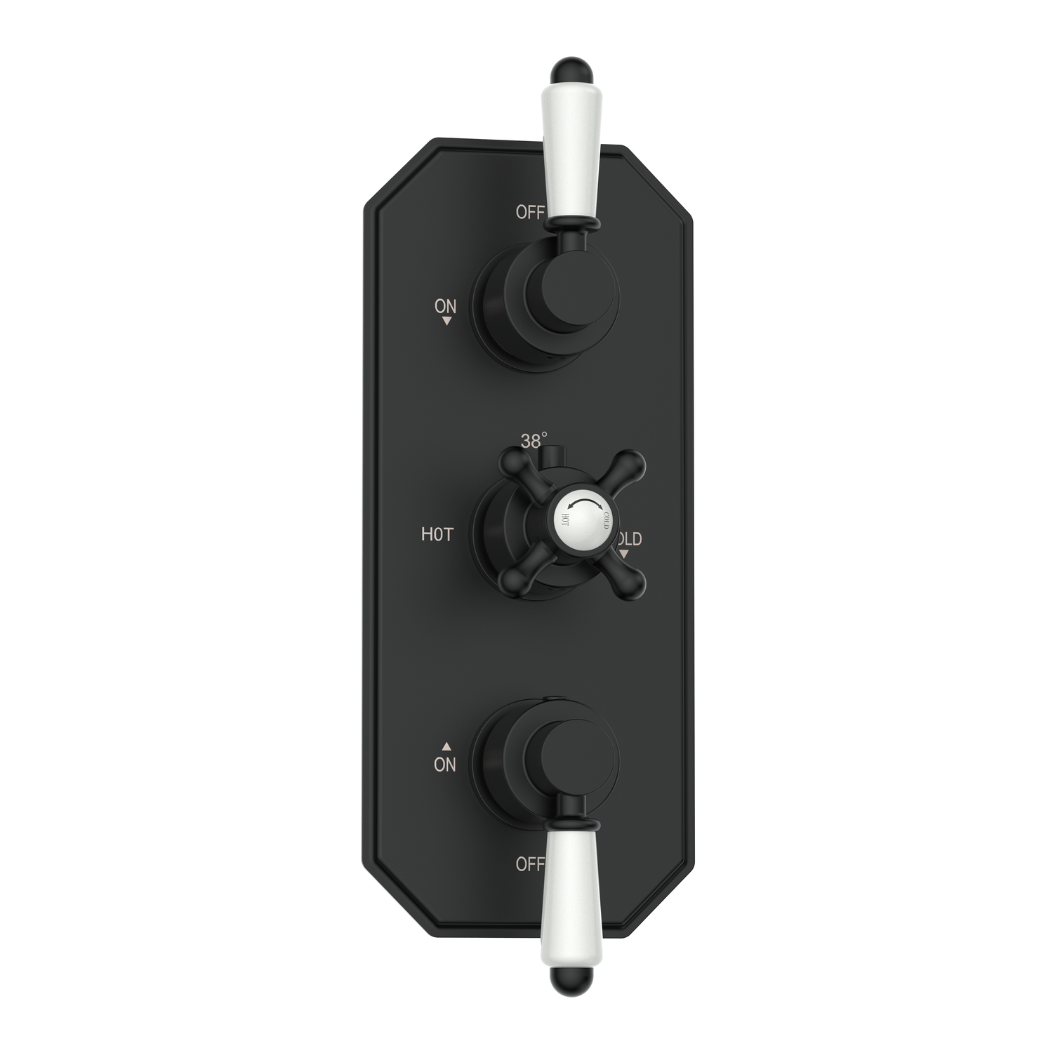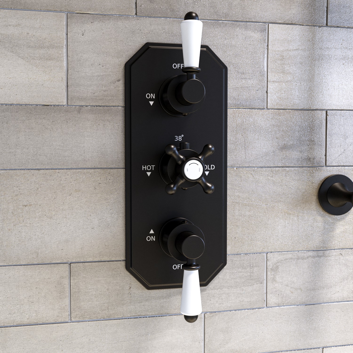 Transform your bathroom with the Cambridge Black Dual Outlet Ceiling Mounted Thermostatic Mixer Shower Set. This traditional-style set combines timeless design with advanced performance, featuring a thermostatic valve and dual outlets for both rainfall and handheld options. The matt black electroplated finish enhances both style and durability, resisting rust and corrosion. With all components included—including both a ceiling-mounted and a wall-mounted arm so you can choose the perfect setup—installation is simple and complete. It’s a perfect fusion of elegance and efficiency, backed by a 3-year warranty for peace of mind.