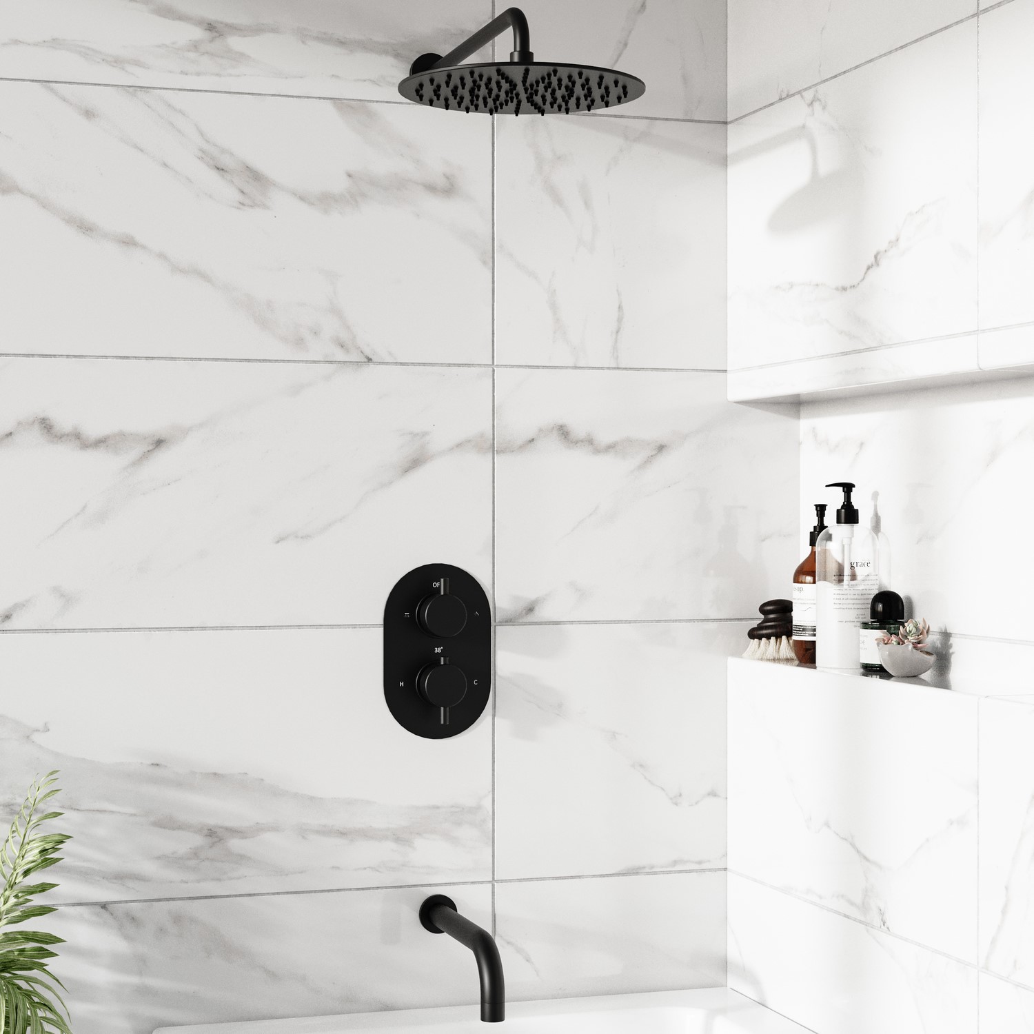 The Arissa Dual Control Shower Set, designed to add a modern touch, is a concealed valve that fits neatly into the wall for a clean, streamlined look. The matching Arissa round wall-mounted spout in matt black is a great addition to any basin or bath. Its smooth, simple shape creates a spa-like feel, perfect for a modern bathroom. The 250mm round shower head creates a relaxing rainfall effect.