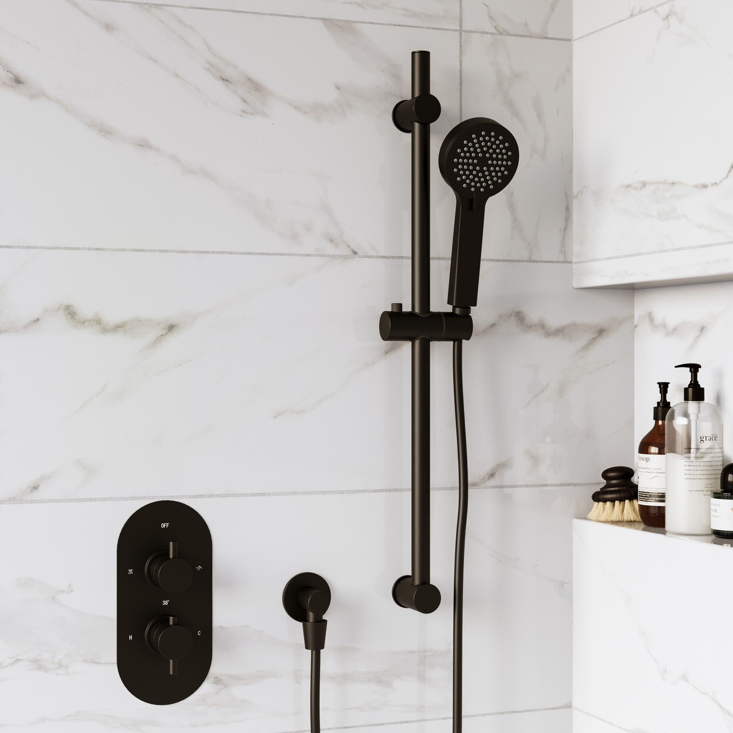 An on-trend monochrome design the Arissa matt black shower set will be perfect for any style of bathroom. For ease of use, the shower head is adjustable in height which allows for more flexible bathing to suit everyone’s needs. Both stylish and practical the Arissa matt black Hand Shower is sure to enhance your bathing experience. Easy installation with everything you need is included: Arissa Concealed Shower Valve (One Outlet), Round Hand Shower, and Round Outlet Elbow. The electroplated finish strengthens the shower's resistance to rust and corrosion, boosting longevity and endurance