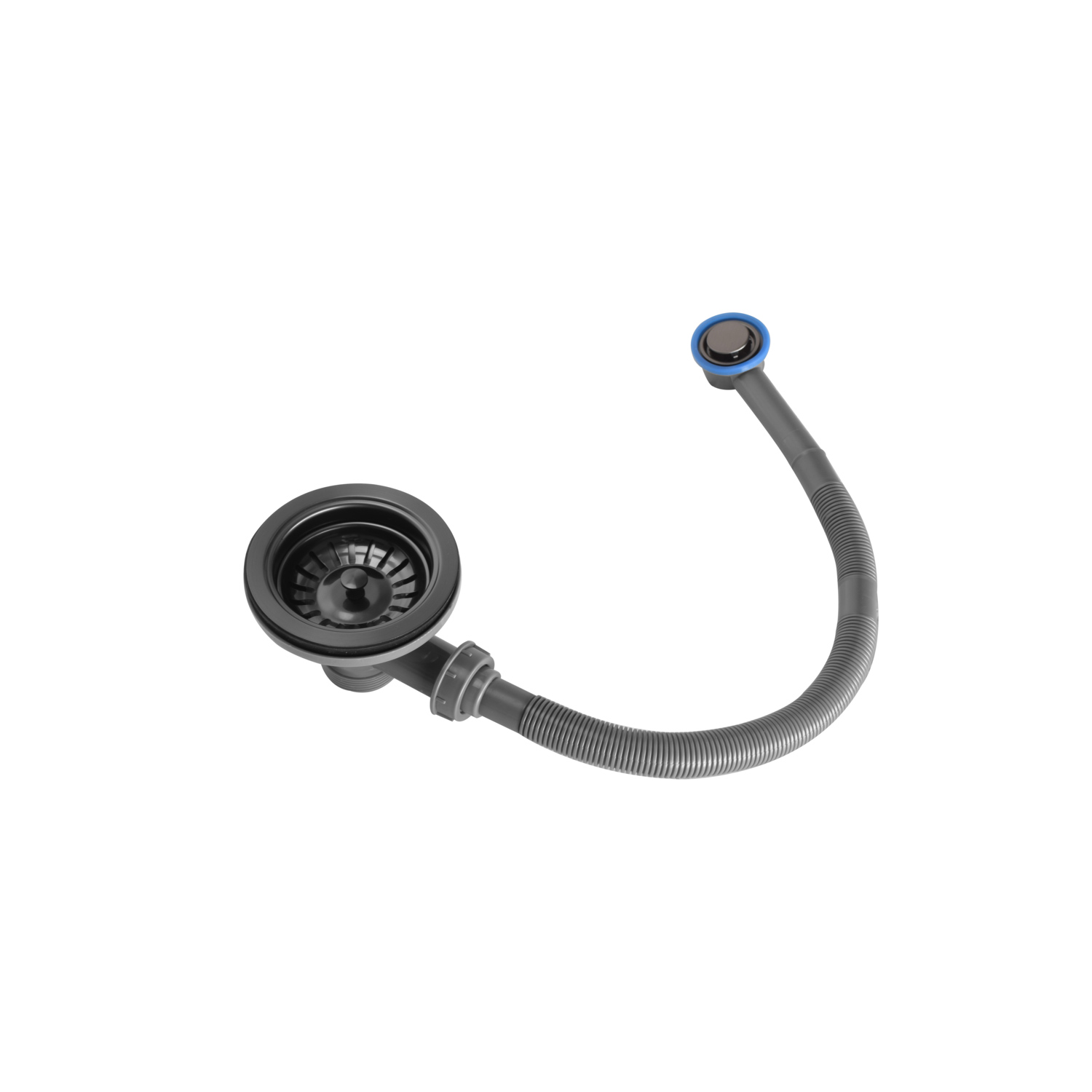 The basket strainer prevents food from entering the drain, and the round overflow protects against water spills. Its flexible pipe allows easy installation, and the system is compatible with most standard sinks for reliable kitchen use.