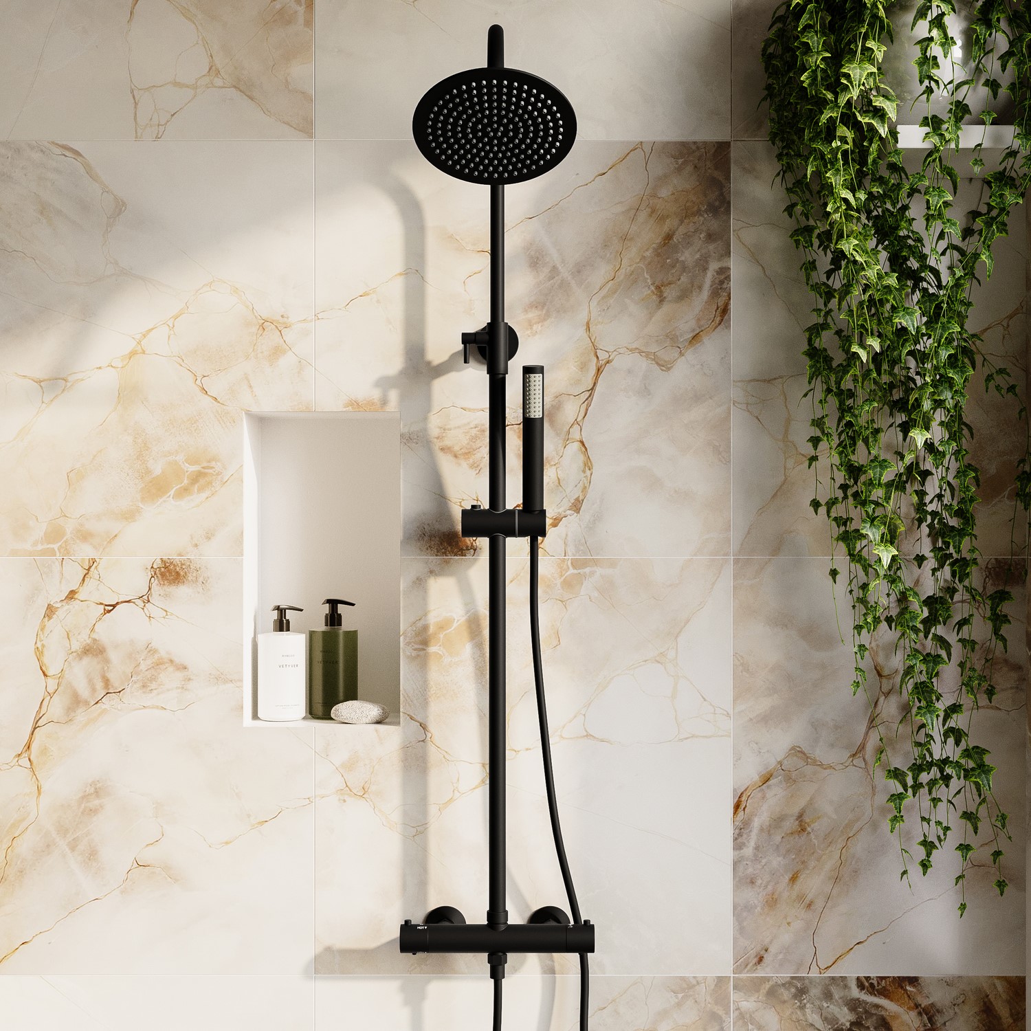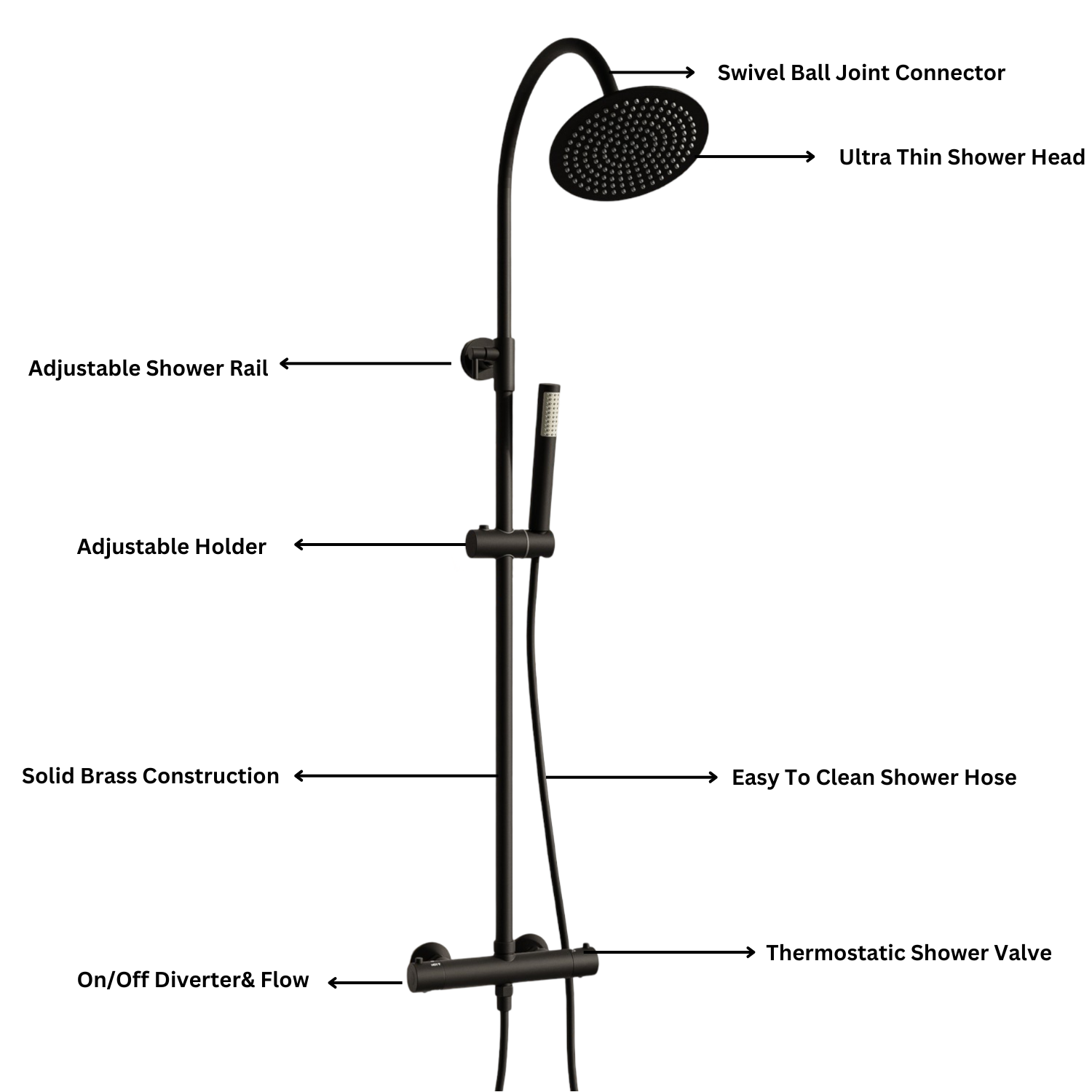 Dual Outlet Shower Kit: Exposed mixer shower with thermostatic temperature control for family-safe showering.Gooseneck Shower Arm: 200mm rainfall-style curved arm overhead shower, slide rail kit and coordinating round hand shower.