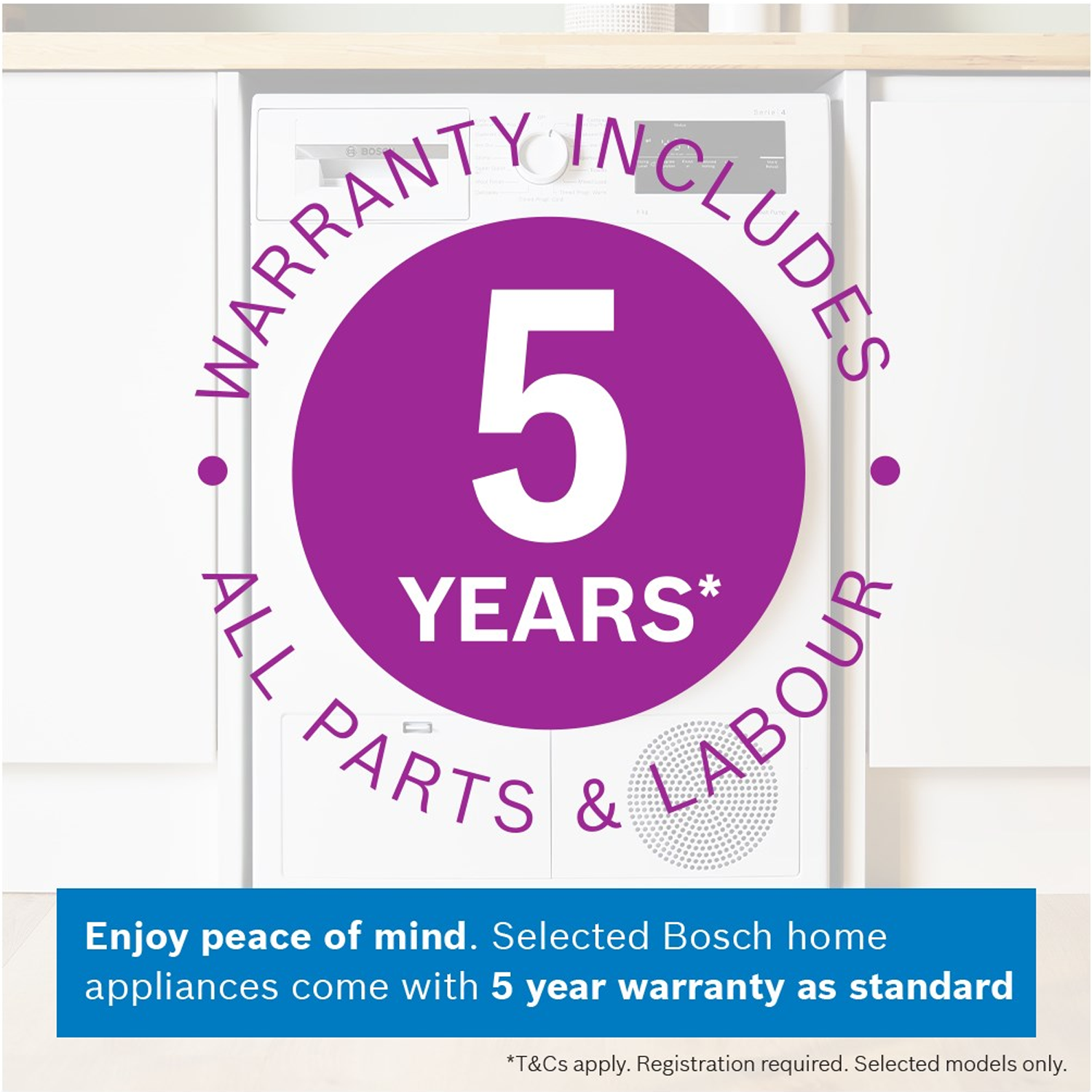 Life gets easier with smart features like Super Quick Dry for when you need clothes fast, and the Sensitive Drying System which treats delicate items gently, meaning less creasing and less time spent ironing. Forgot a sock? The Reload function lets you add items mid-cycle. This Bosch tumble dryer also runs quietly thanks to its Anti-Vibration design, and the Easy Clean filter makes upkeep simple. With a 5-year warranty, you get lasting peace of mind, making this a smart and reliable choice for any busy home.