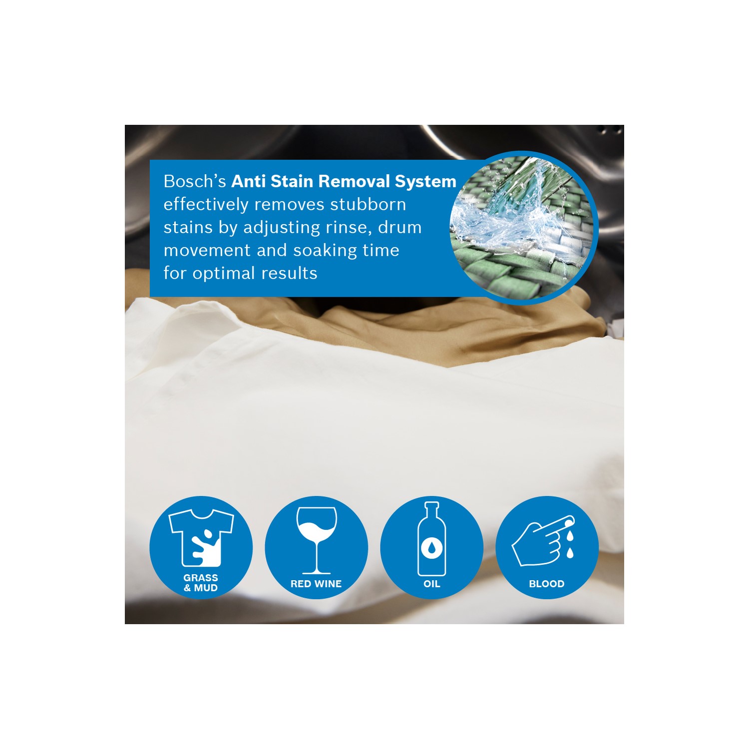 Say goodbye to stubborn stains. The Anti Stain system tackles four of the trickiest marks – butter or oil, grass, red wine, and blood – without the guesswork. It automatically adjusts the temperature, drum movement, and soaking time to lift stains with ease. No need for pre-treating or second washes – just brilliant results, every time.