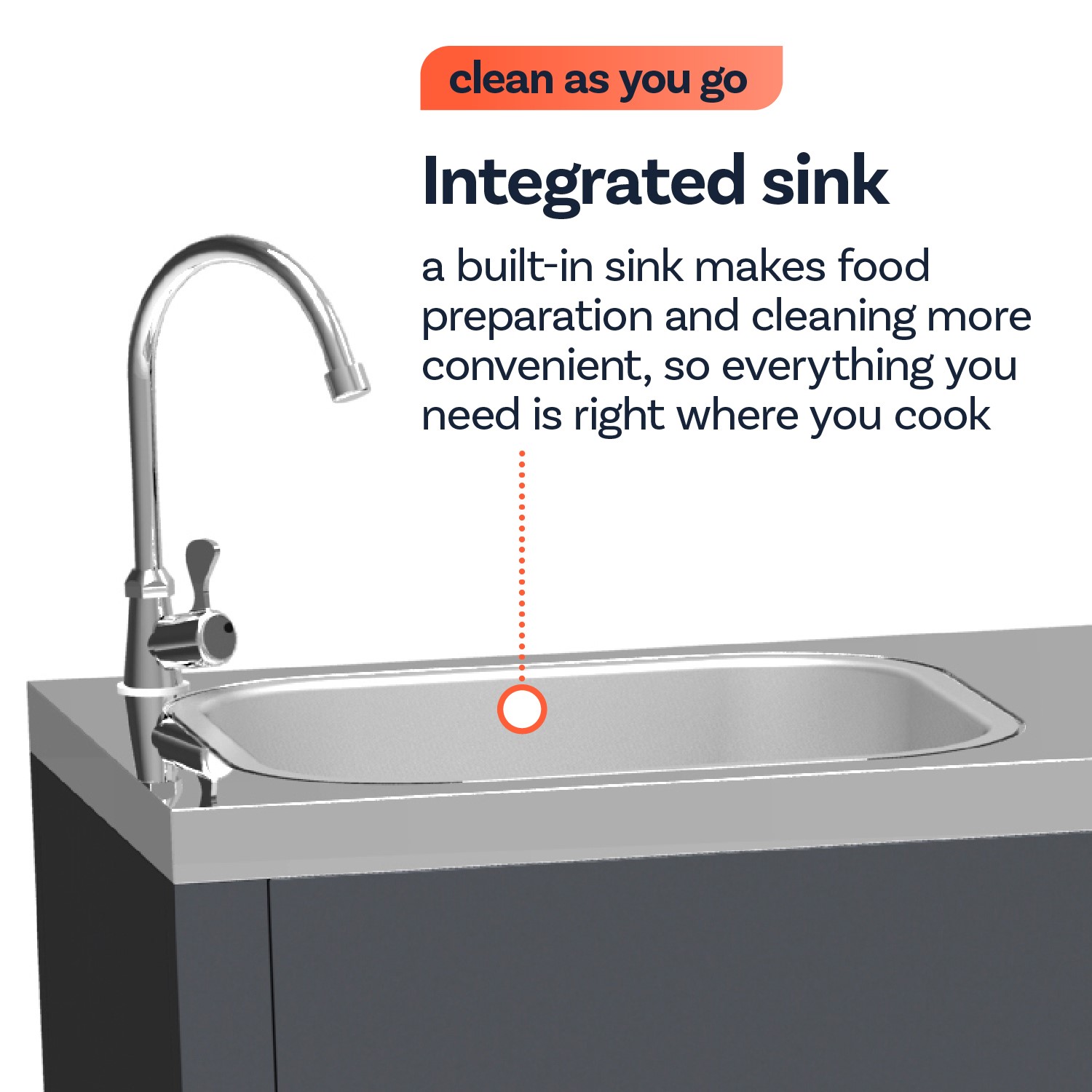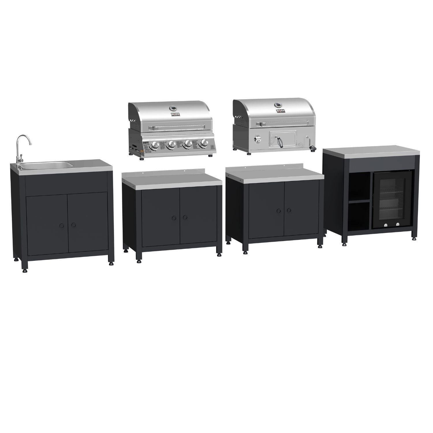 At the centre is a powerful 4-burner gas BBQ, ideal for everyday grilling, searing, and cooking for larger groups. Alongside it, a separate charcoal BBQ unit delivers classic smoky flavour for traditional barbecuing. An integrated stainless steel sink unit provides a practical food prep and washing area, while the built-in beverage cooler keeps drinks cold and close at hand.