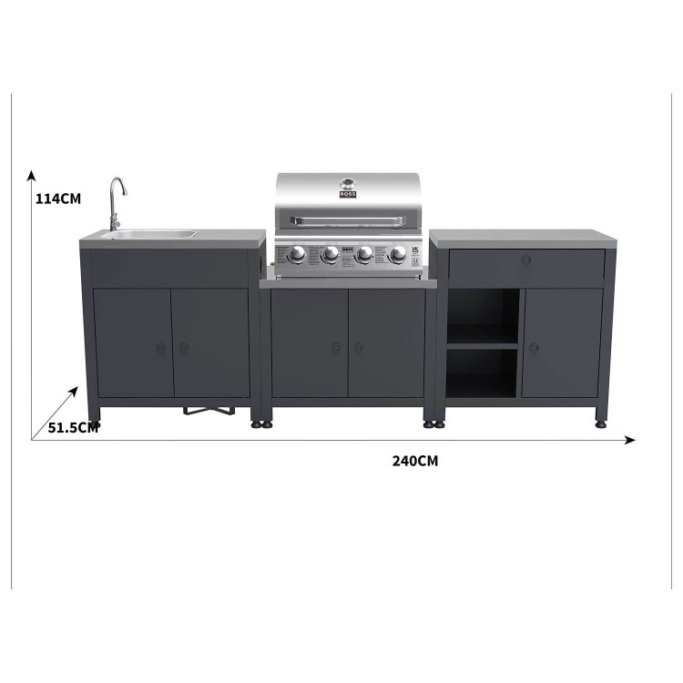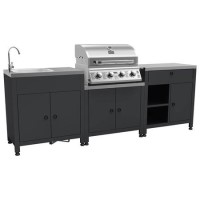 The built-in sink with tap helps you clean up as you go along without abandoning your cooking station; all you need to do is attach your hose pipe. There’s plenty of storage to keep essential sides, sauces, and juicy meats waiting for their turn on the grill, plus a worktop to help you prepare. There’s even a gas cylinder holder beneath to keep the canister out of the way.