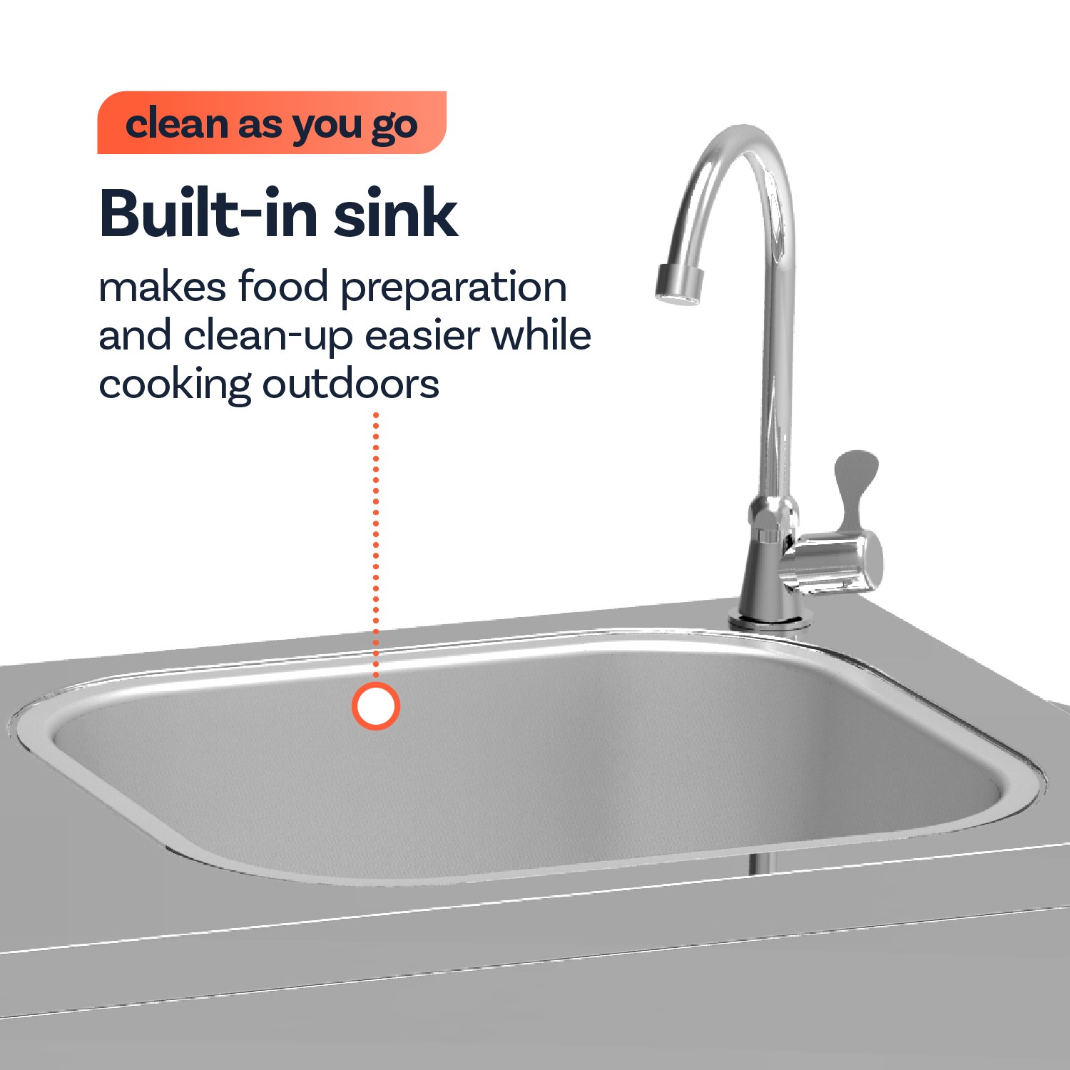 The SUS430 stainless steel worktop and sink provide a durable, hygienic surface for preparing food and cleaning utensils outdoors. A chrome faucet with extra connector allows flexible installation, making this BBQ prep station suitable for modular or semi-permanent outdoor kitchen layouts. .