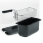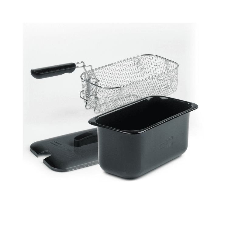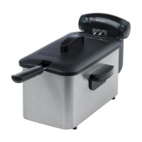Deep fat fryer with a 3L oil capacity, 1kg food capacity in a stainless steel finish and black plastic lid. Cool zone area, dishwasher safe and removable parts.