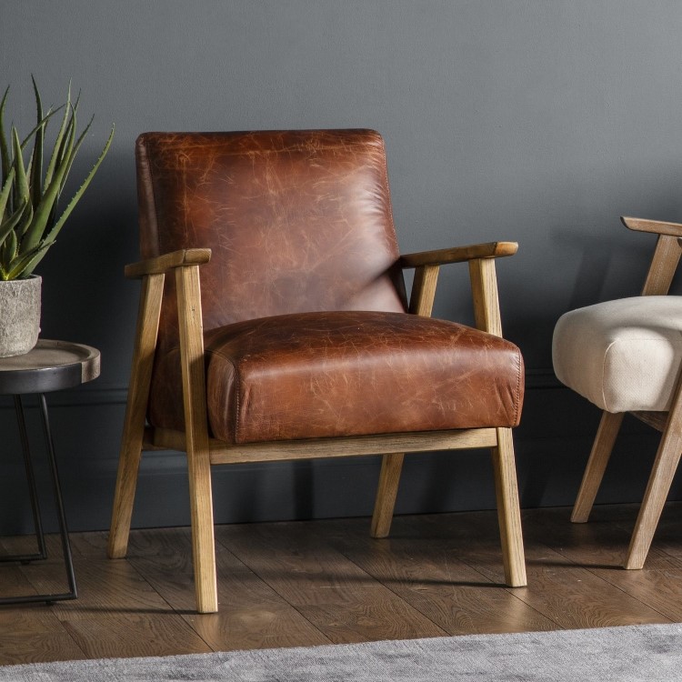 Add a touch of class to your home with the Neyland accent chair finished in vintage brown leather with sturdy wooden arms and legs.