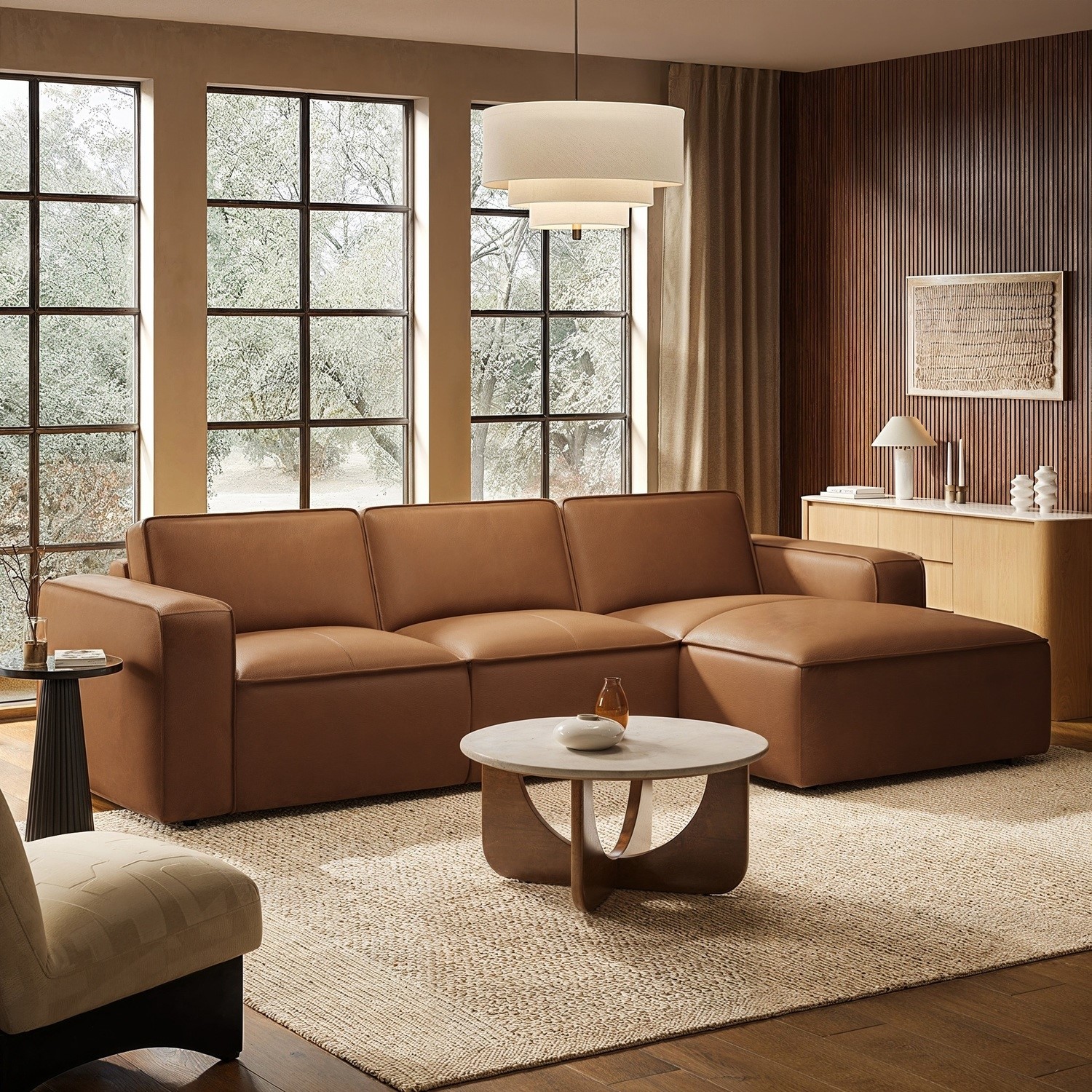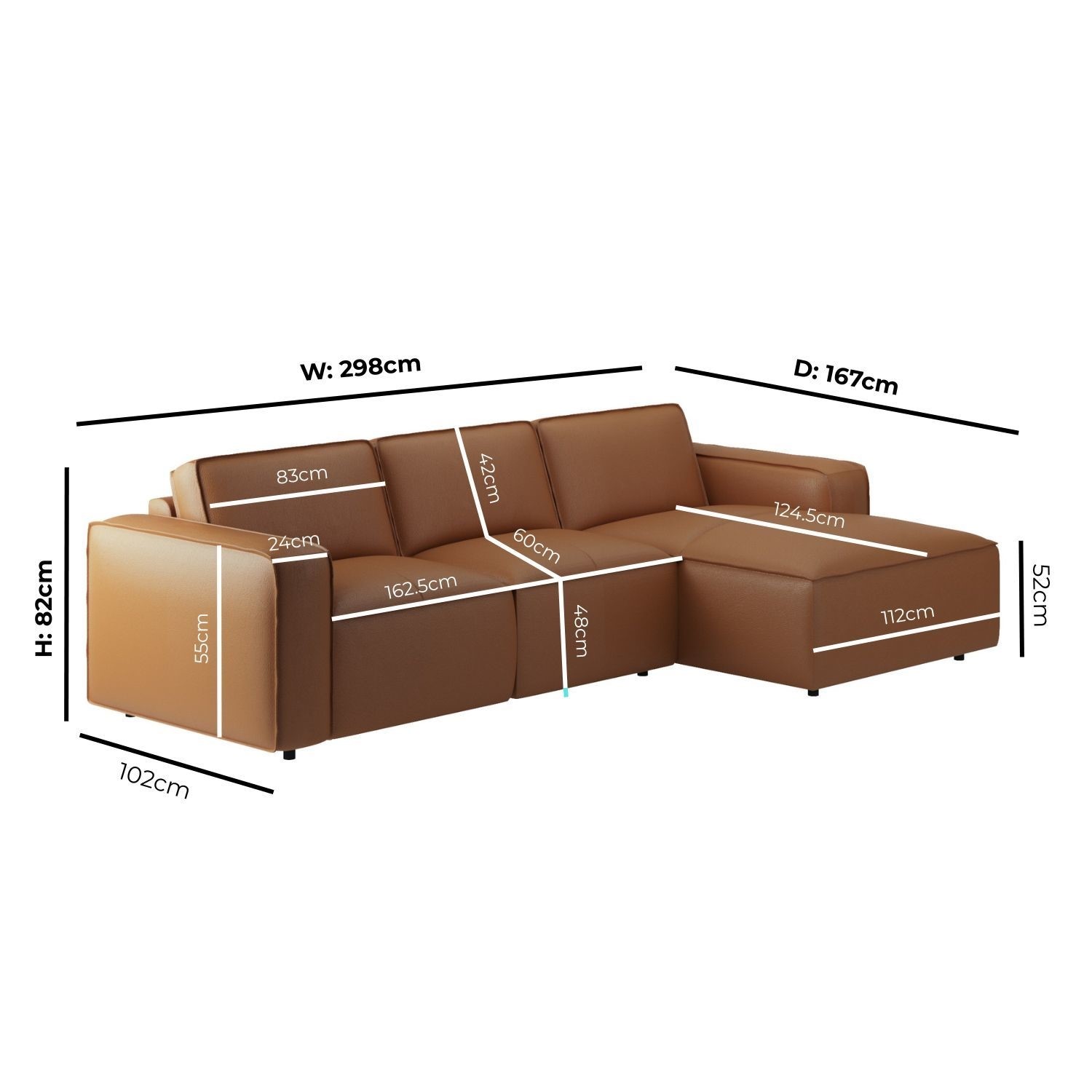 Elevate your living space with the Samuel Right-Hand Chaise Sofa, where premium craftsmanship meets modern design. Upholstered in genuine tan brown leather, its clean silhouette is complemented by wide, square arms, sleek lines, and thoughtful details like refined piping and pleated accents. Designed to seat four people comfortably, it offers generous space for lounging, making it a stylish and inviting centrepiece for any contemporary interior.