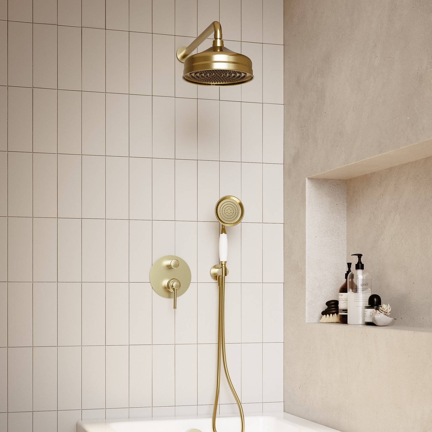 The Brushed Brass Shower Set combines modern functionality with timeless elegance, making it a versatile choice for any bathroom. The dual outlet concealed valve features a sleek, round backplate and slim lever handles for a clean, minimalist look, while subtle knurled detailing and a warm brushed brass finish add a traditional twist. With ceramic disc technology, it delivers precise temperature control, smooth flow adjustment, and drip-free performance, while the dual manual controls make it simple to fine-tune your showering experience.