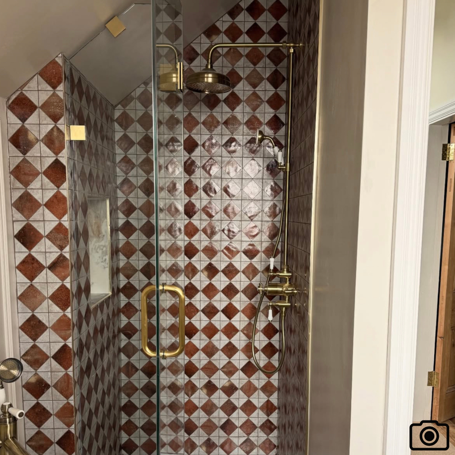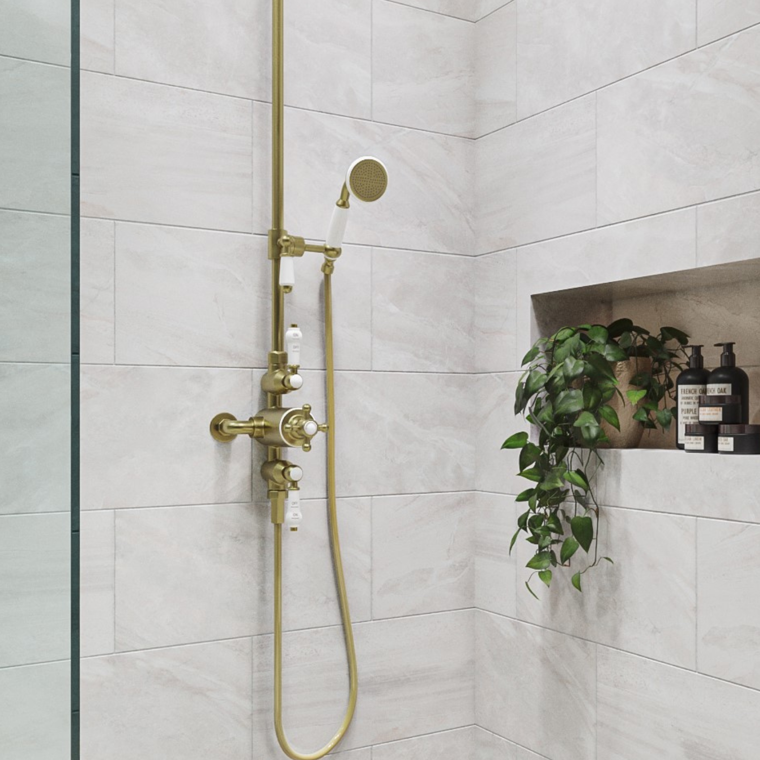 The shower is crafted from high-quality brass with ceramic detailing on the handles and coated with a brushed brass PVD finish, making it both durable and visually striking. The rainfall shower head delivers a gentle, luxurious flow, while its refined styling suits both traditional and heritage-inspired interiors.