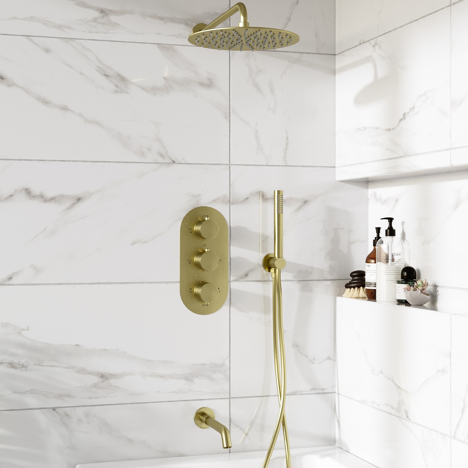 The Arissa Brushed Brass Triple Outlet Wall-Mounted Thermostatic Mixer Shower Set combines cutting-edge functionality with a stunning design to elevate your bathroom into a modern spa retreat. Designed for minimalist spaces, this shower set includes a 250mm overhead rainfall shower head, a three-outlet thermostatic valve, a detachable hand shower, and a waterfall-style bath filler spout.