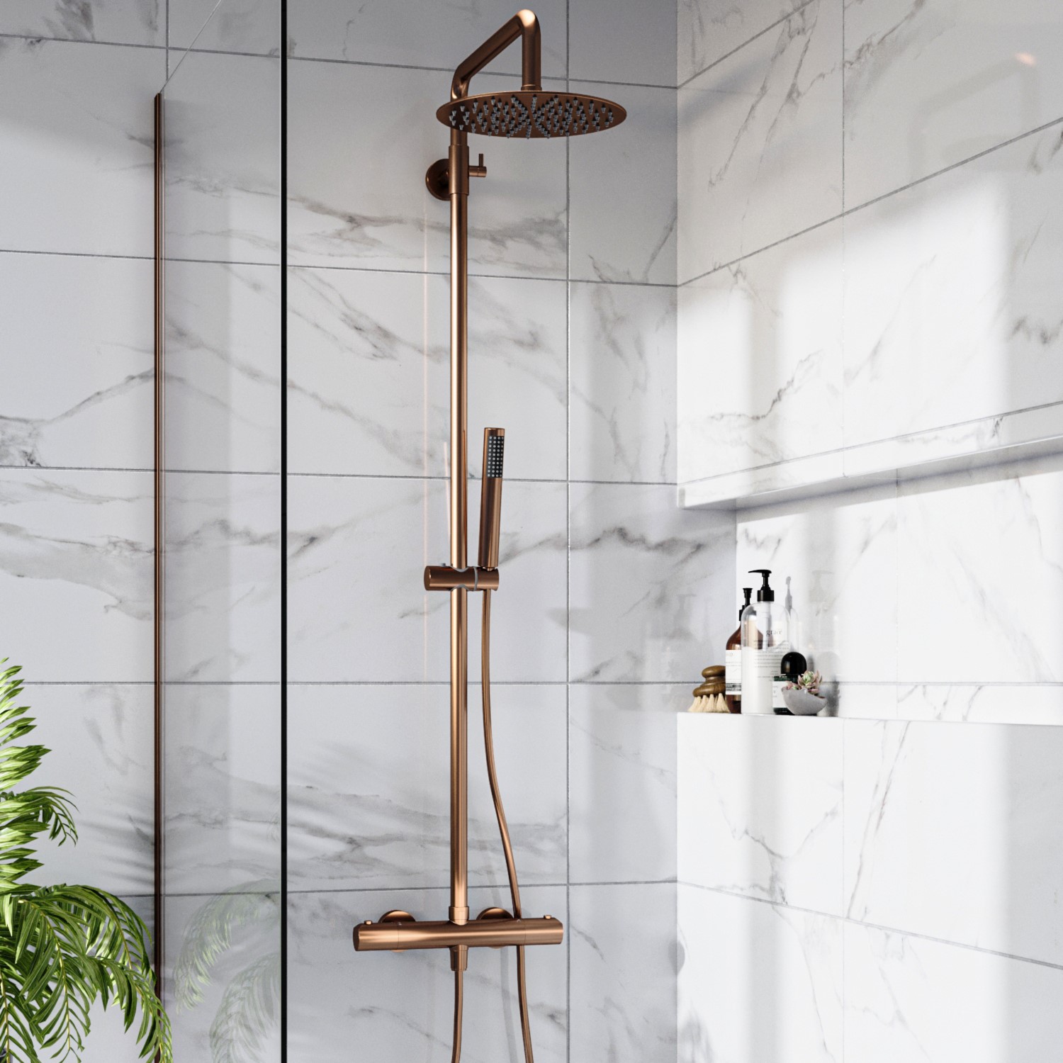 - Includes thermostatic 2 outlet mixer shower set with a modern round styling and brushed bronze finish