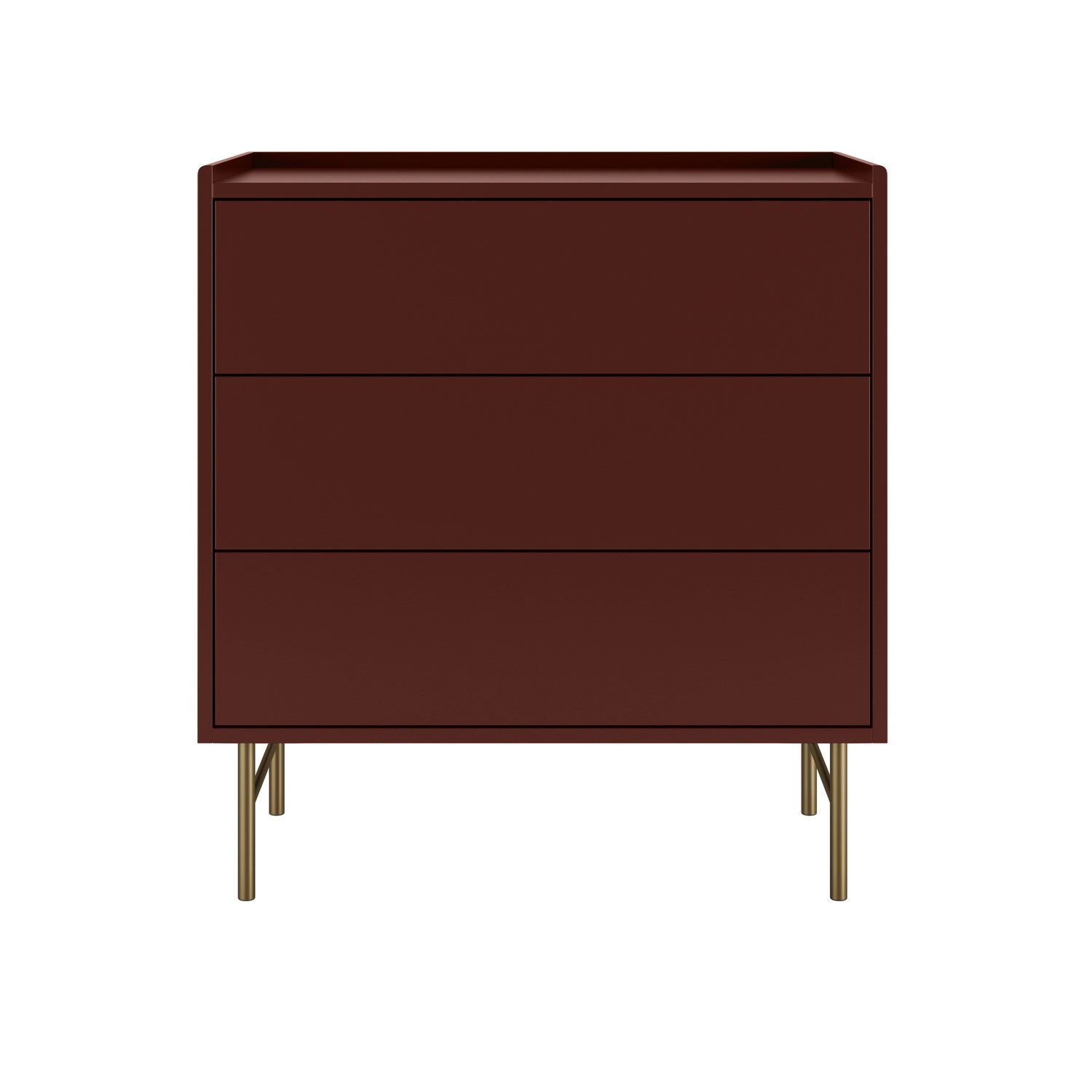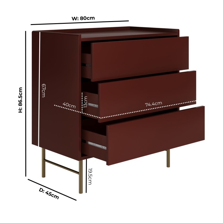 The Zane Chest of 3 Drawers combines sleek, contemporary design with practical functionality, making it a refined bedroom dresser. Its minimalist, handle-free form features six spacious push-to-open drawers on smooth metal runners, perfect for storing clothes, bedding, and everyday essentials. A subtle border around the top keeps surface items secure, while the warm burgundy matt finish and contrasting brushed-gold legs add a touch of understated luxury. Elevated for easy cleaning underneath and crafted from durable materials, the Zane chest of 3 drawers is a stylish, modern, and long-lasting addition to any bedroom.