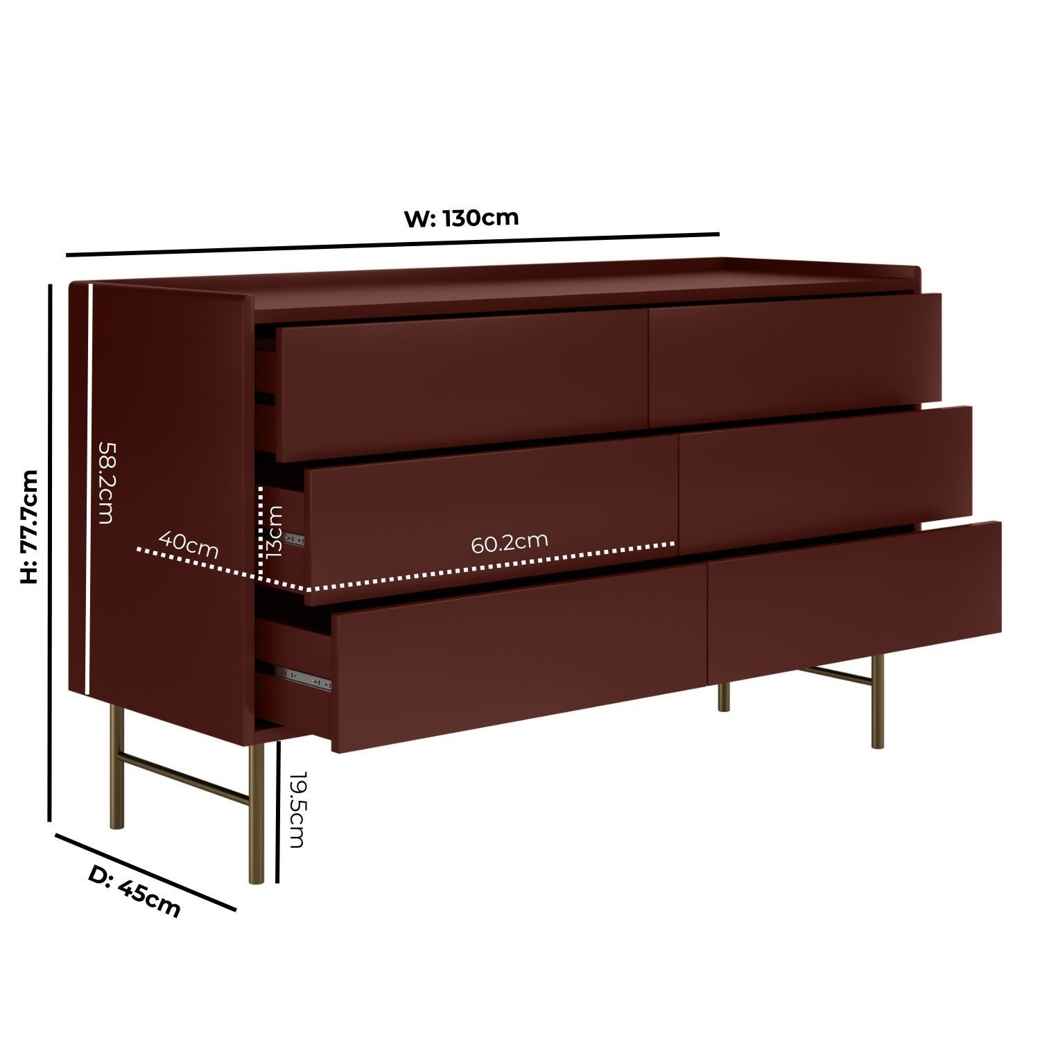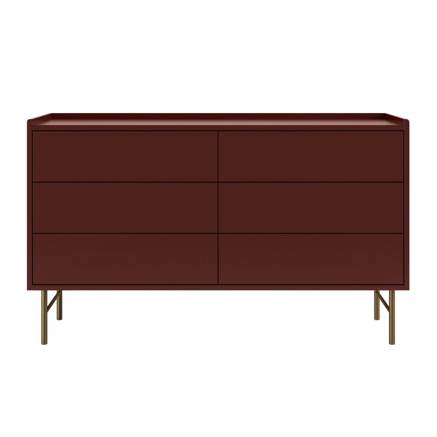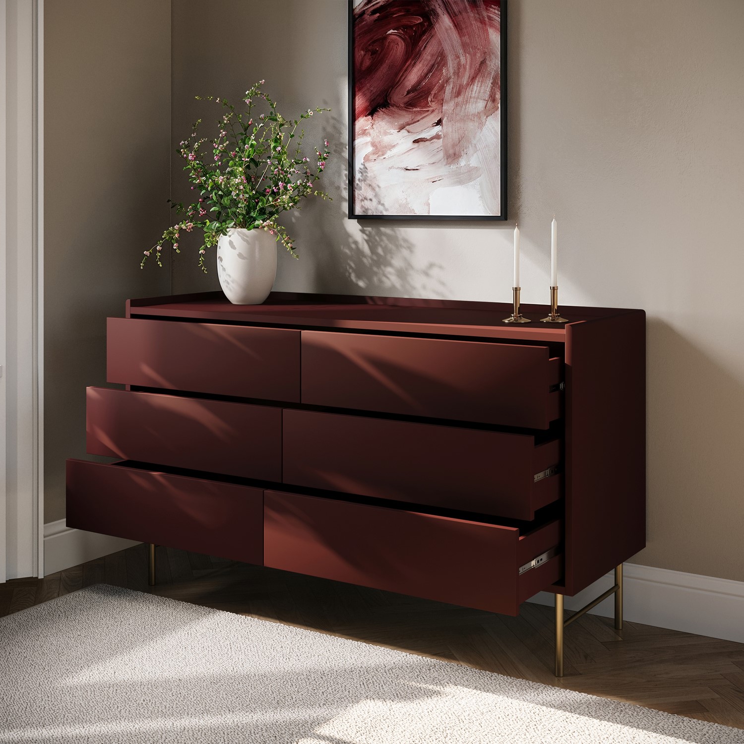 The Zane Chest of 6 Drawers combines sleek, contemporary design with practical functionality, making it a refined bedroom dresser. Its minimalist, handle-free form features six spacious push-to-open drawers on smooth metal runners, perfect for storing clothes, bedding, and everyday essentials. A subtle border around the top keeps surface items secure, while the warm burgundy matt finish and contrasting brushed-gold legs add a touch of understated luxury. Elevated for easy cleaning underneath and crafted from durable materials, the Zane chest of 6 drawers is a stylish, modern, and long-lasting addition to any bedroom.