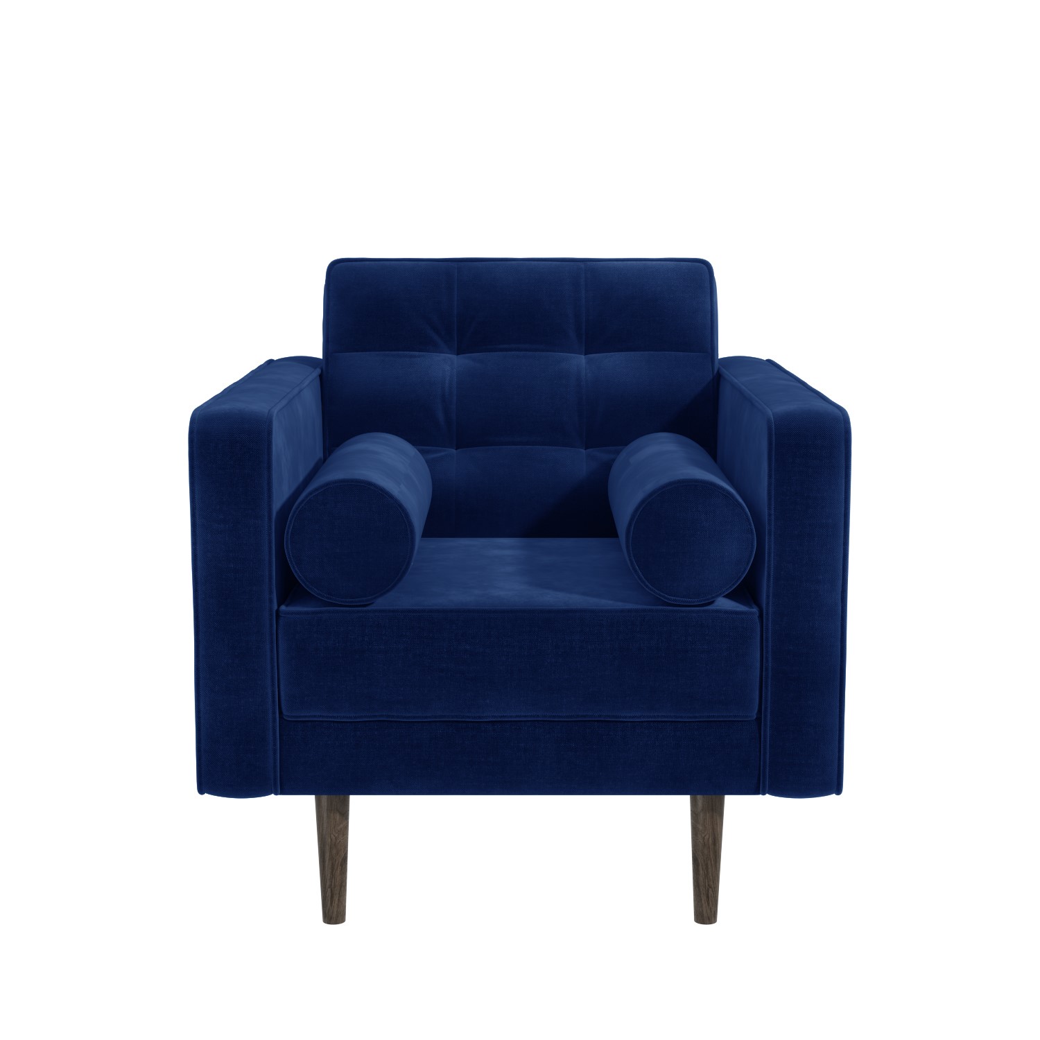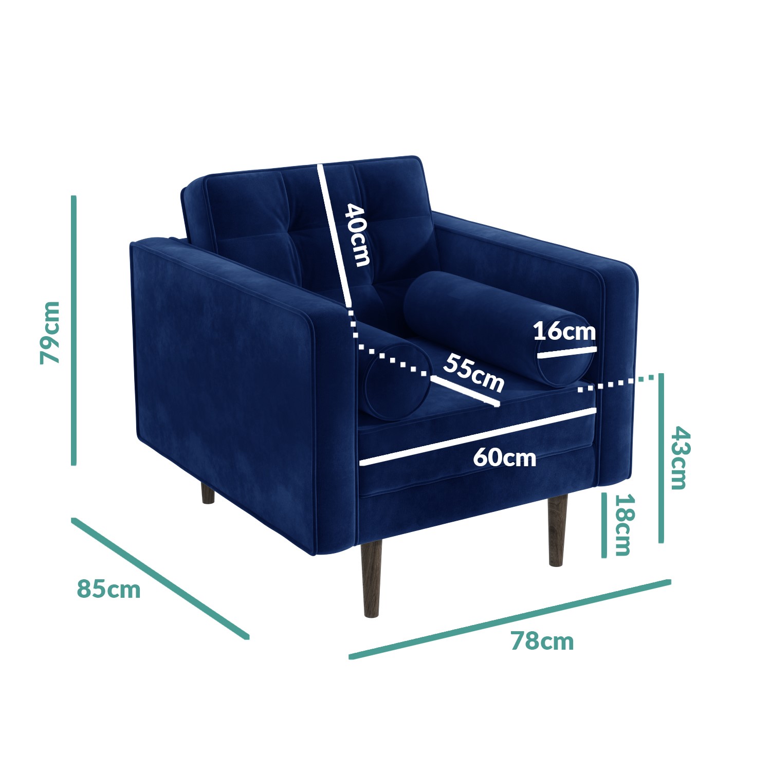 Discover maximum comfort and minimum maintenance with this gorgeous, foam-filled, blue Elba armchair. The clean, square lines are inspired by the mid-century, whilst the double piping and buttoned back add just the right amount of opulence. The clean arms and tall tapered legs in a contrasting dark birch wood keeps the design fresh.