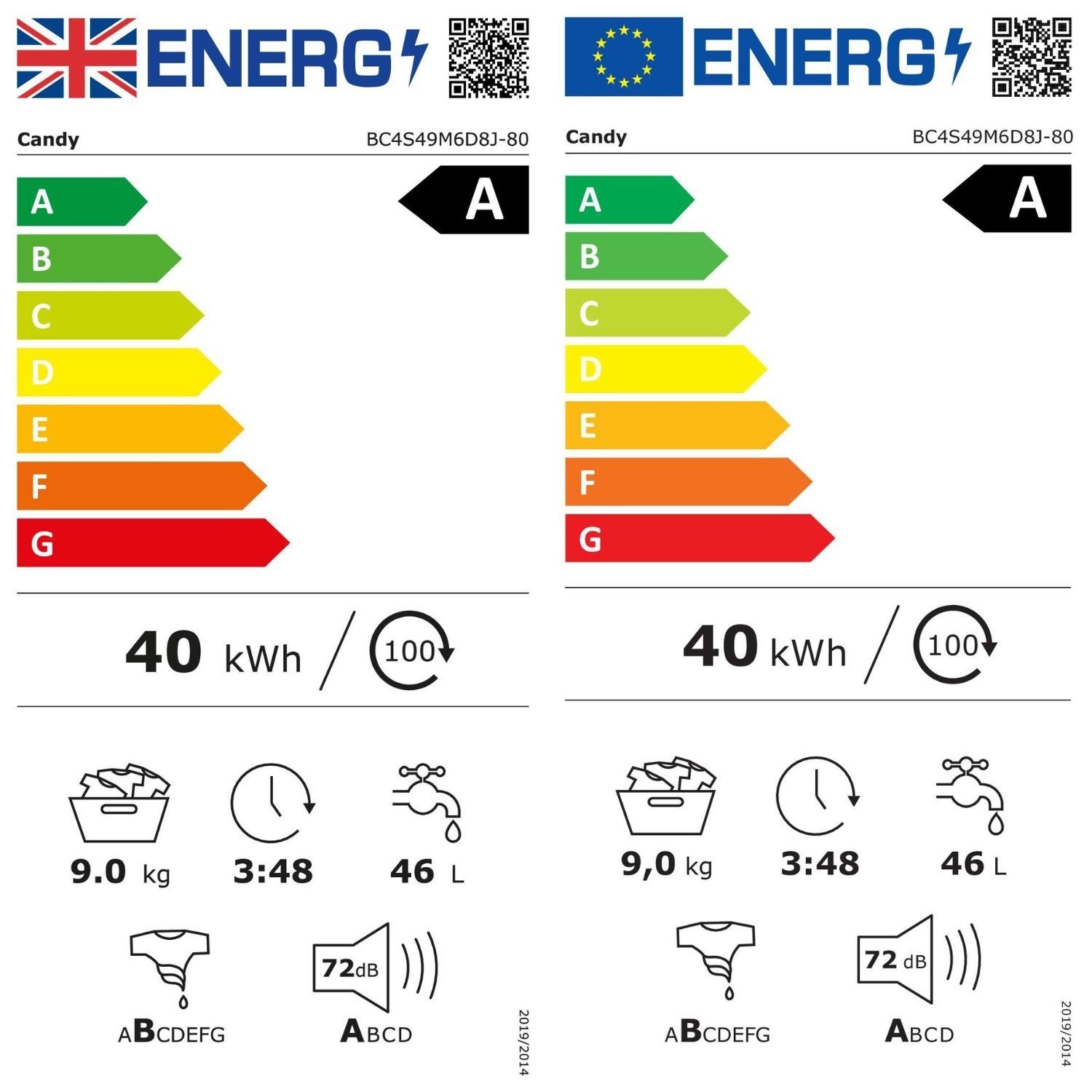 Thanks to the reduced energy consumption, Candy is 20% more efficient than a standard "A" class washing machine. Compared with the limit value of A-class as per Commission Delegated. Regulation (EU) 2019/2014