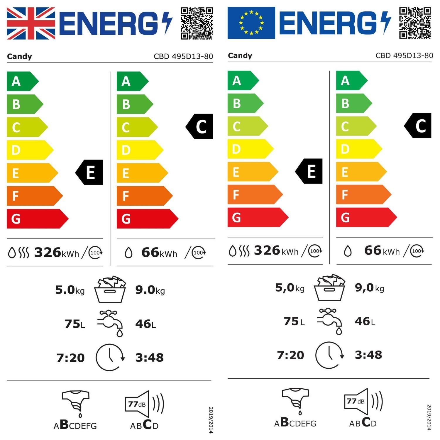 This washer dryer, using the washing cycle only, is in C class. In compliance with the New Energy Label and comparing with the G class, reduces consumption for at least 34%, saving energy, money and respecting the environment.