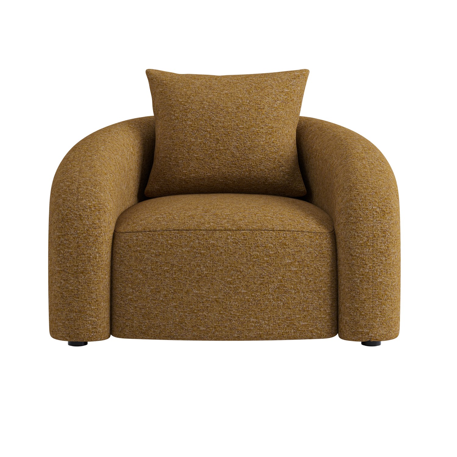 Elevate your living space with the Zuri armchair, inspired by luxury and modern design. Upholstered in soft-touch caramel brown chenille fabric, it features smooth curves, layered cushioning, and generous plush padding that adds style to any room. Its perfect fusion of style and functionality makes it an ideal choice for those seeking both comfort and aesthetic appeal in their home or even a unique accent armchair. It has an additional matching back cushion for maximum comfort, along with black legs.