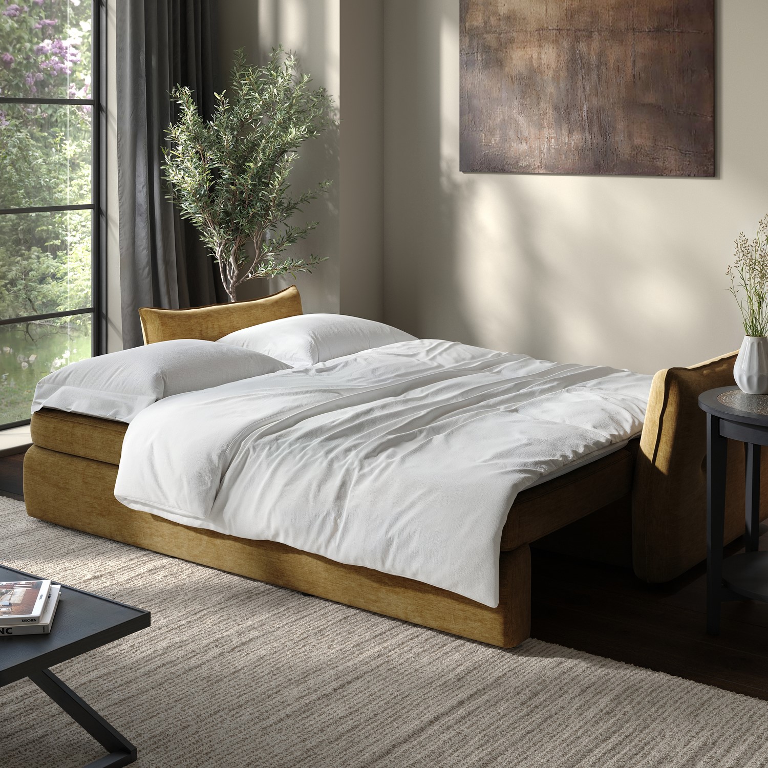 Be perfectly prepared for overnight guests with the Gaia Futon Sofa Bed in a stunning golden brown chenille fabric. Easily transform the 3-seater sofa into a bed with the simple and smooth pull-out mechanism. This fold-out sofa bed is complete with a built-in memory foam mattress top, creating a comfortable double bed for your guests, ensuring a great nights sleep. This sofa bed features a textured chenille fabric with a caramel brown hue that instantly adds warmth to your space. The durable chenille fabric is perfect for busy households, requiring little maintenance to keep it looking its best. Under the seats you'll find a hidden storage compartment, perfect for storing your bedding and any other essentials. For additional comfort and support, this sofa bed is foam and fiber-filled and comes with 2 matching throw cushions.