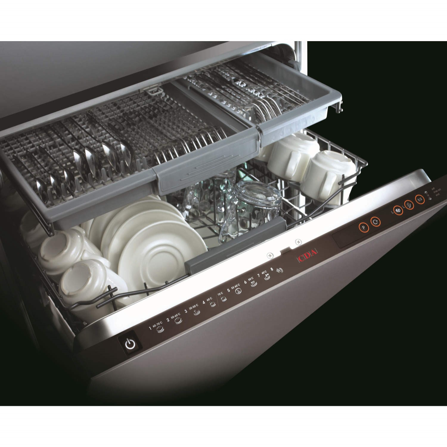 This top of the range dishwasher from CDA delivers exceptional cleaning results to make your life that little bit easier. There are a total of 9 programmes available; helping you to achieve perfect results every time. Whether it’s a quick 30 minute cycle or a delicate programme for your glassware, you can be sure to find the perfect solution with this functional and efficient dishwasher. There's even a delay timer of 1 – 19 hours so you can have the dishwasher clean your dishes at a time that suites you.