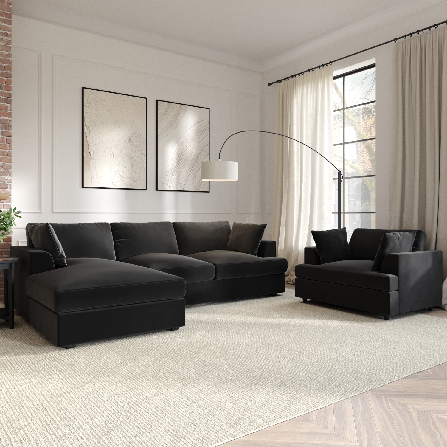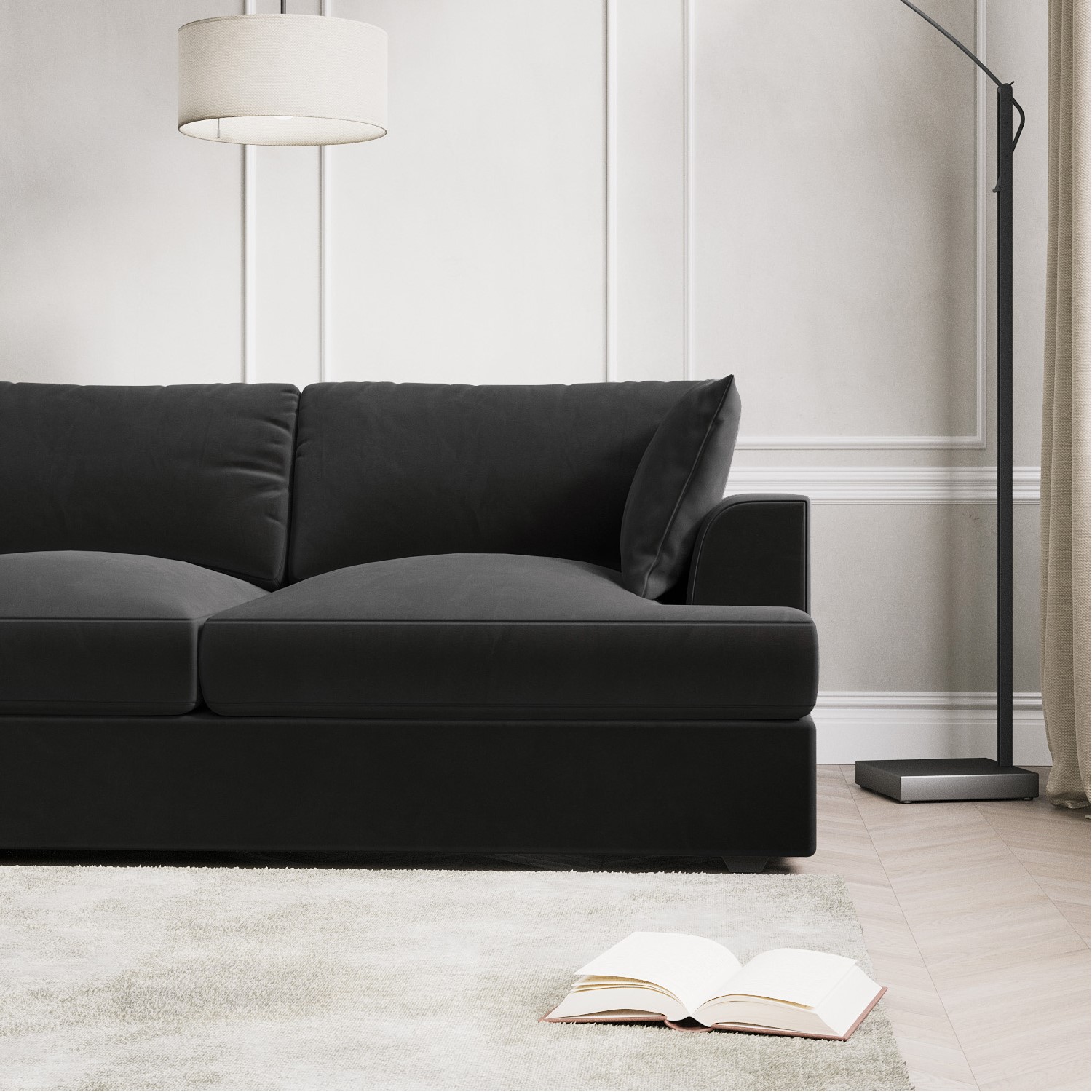 - Luxuriously soft dark grey velvet L-shaped sofa