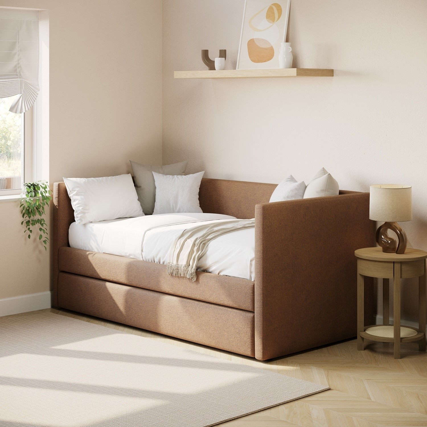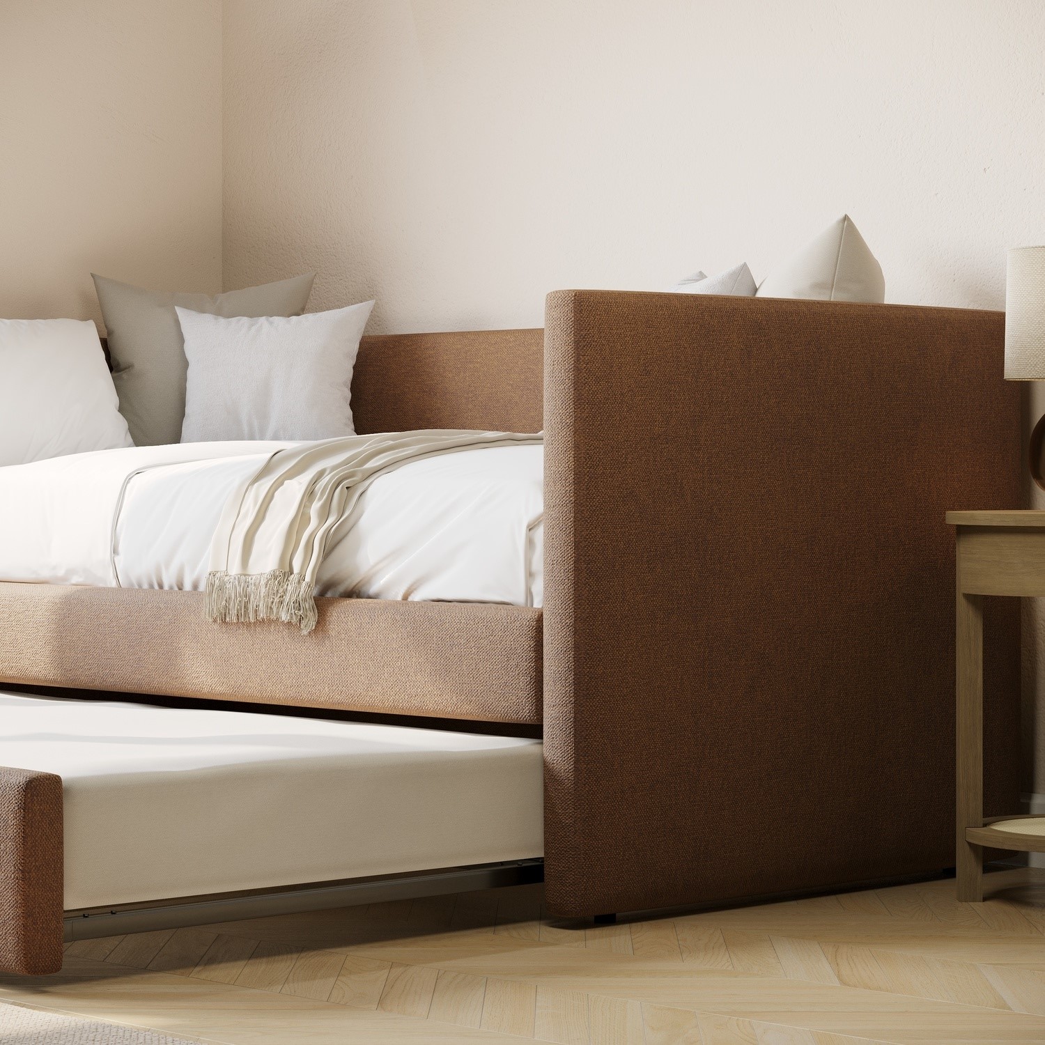 The Amie Day Bed with Trundle is the perfect blend of style and practicality, making it a great addition to any home. Upholstered in soft-touch burnt orange chenille fabric, it adds warmth and elegance to your space. During the day, it’s a comfy spot to relax, and at night, it easily transforms into two cosy sleeping spaces. The smooth pull-out trundle provides extra room for guests, making it a perfect choice for small rooms, guest areas, or multifunctional spaces.
