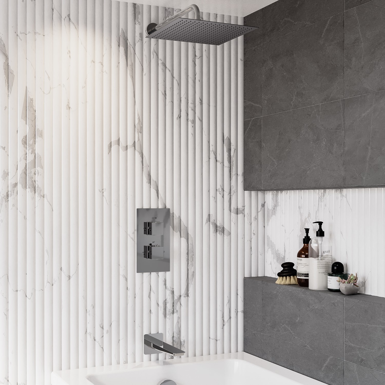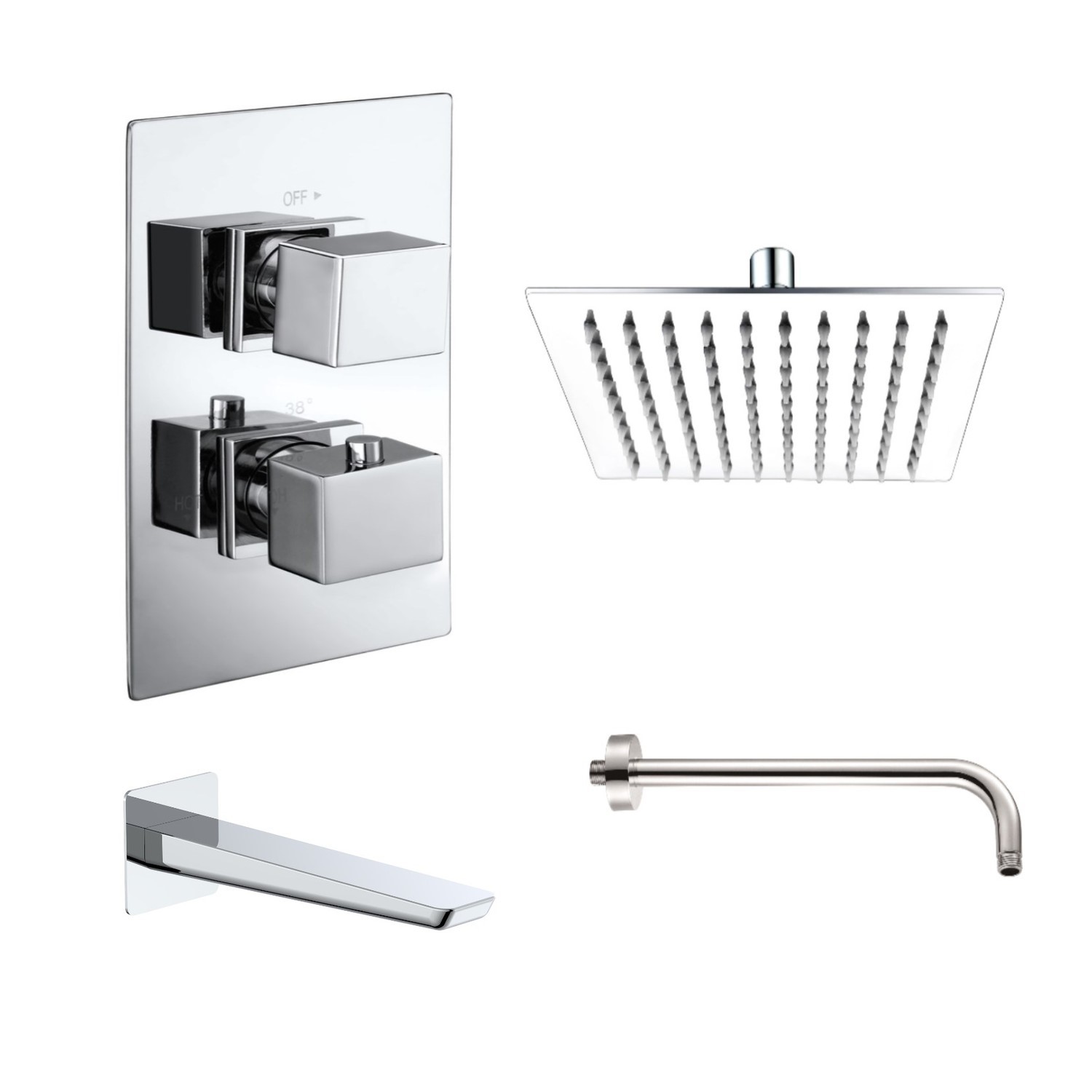 Transform your shower experience with this modern combination of the Cube Square Twin Shower Concealed Valve and the 250mm Ultra-Slim Square Shower Head. The concealed valve's sleek design and dual outlet functionality provide both aesthetic appeal and practical versatility, allowing you to customise your shower setup with ease.