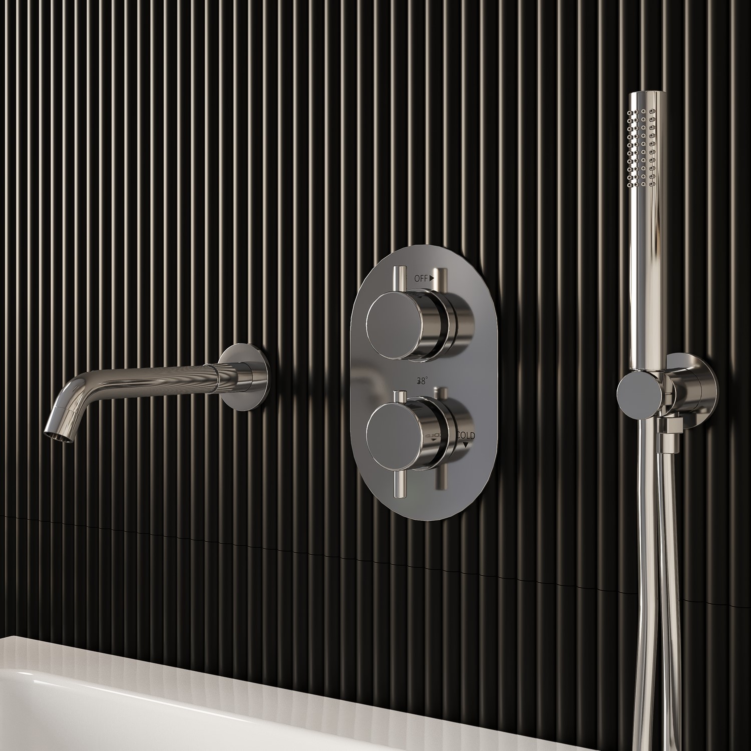 This Arissa shower bundle in polished chrome is the perfect fit for a modern, minimalist bathroom, recessed for a streamlined look.