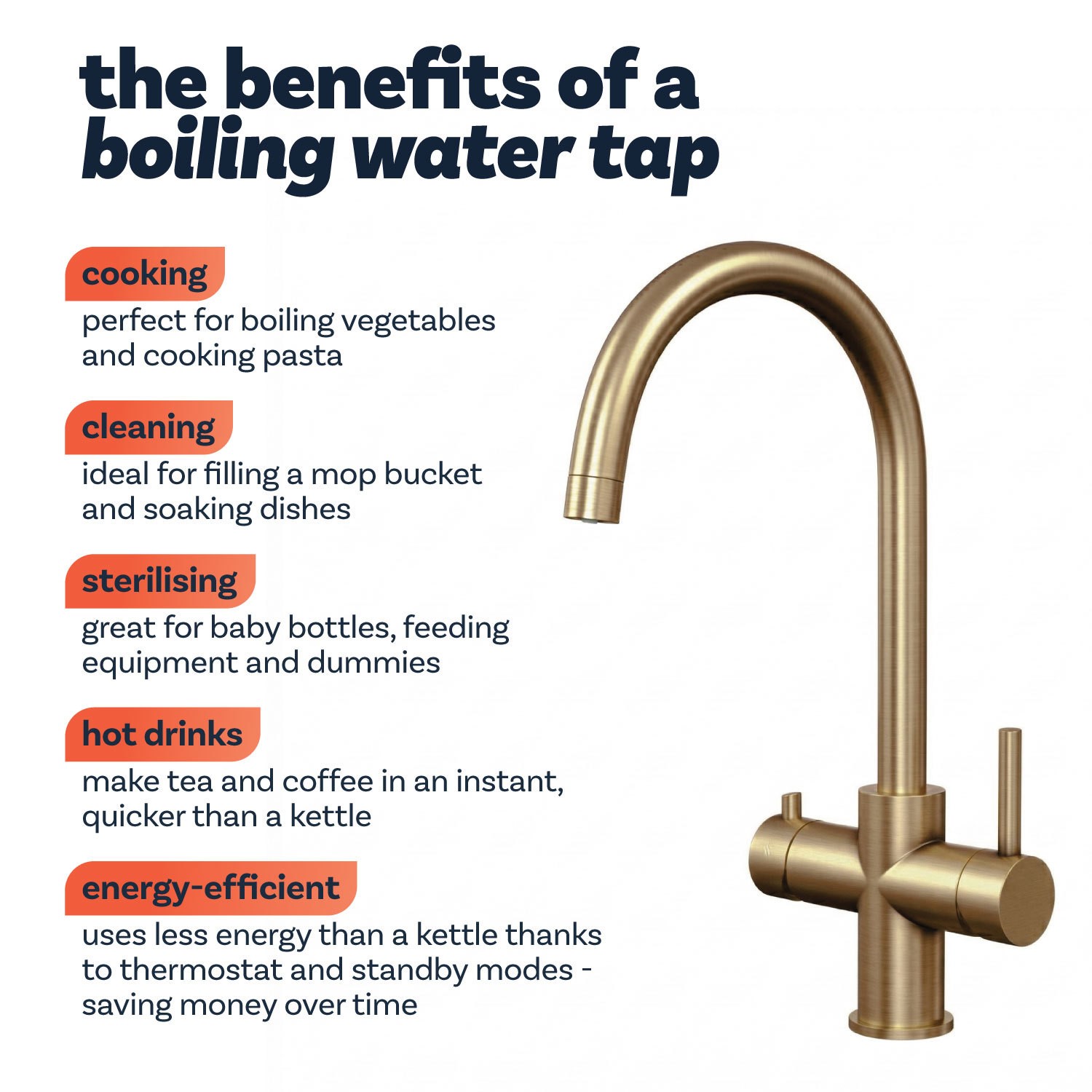 Enjoy instant access to boiling, hot and cold water from a single boiling hot water tap. Designed to simplify everyday tasks, this 3-in-1 solution is perfect for preparing hot drinks, filling pots and speeding up cleaning without the need for a separate kettle. The compact boiler tank delivers a consistent supply of hot water and reheats quickly after use, ensuring it’s always ready when you need it. Adjustable temperature settings give you greater control, while the intuitive controls make operation simple and convenient for daily use. A boiling water tap makes everyday tasks quicker and easier. From making tea and coffee to speeding up cooking and tackling washing up. Built with safety and efficiency in mind, it features a secure safety lock to prevent accidental use, a cool safe-touch surface for added protection and this tap uses up to 40% less energy than a traditional kettle, helping reduce both energy consumption and household costs.