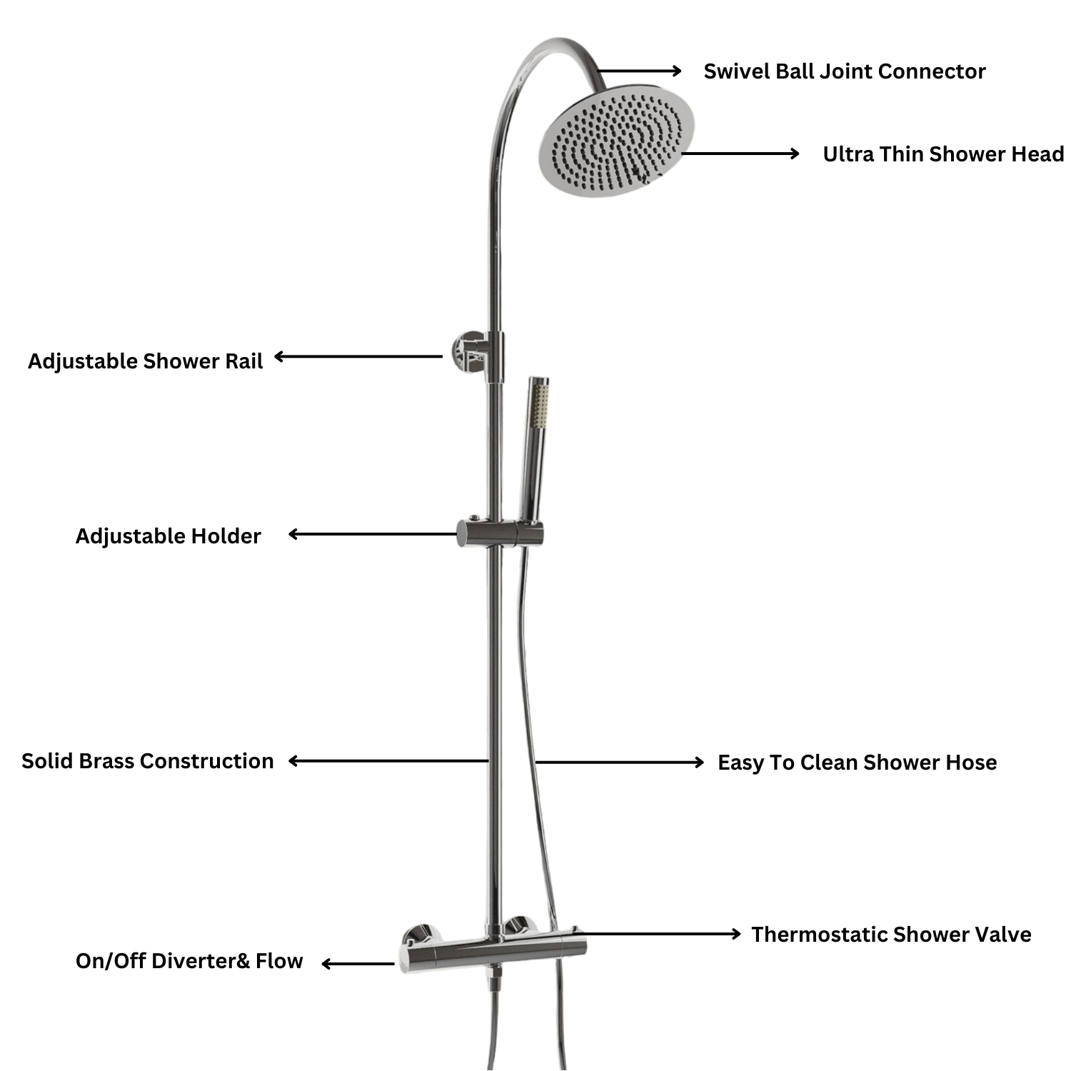 Dual Outlet Shower Kit: Exposed mixer shower with thermostatic temperature control for family-safe showering.Gooseneck Shower Arm: 200mm rainfall-style curved arm overhead shower, slide rail kit and coordinating round hand shower.