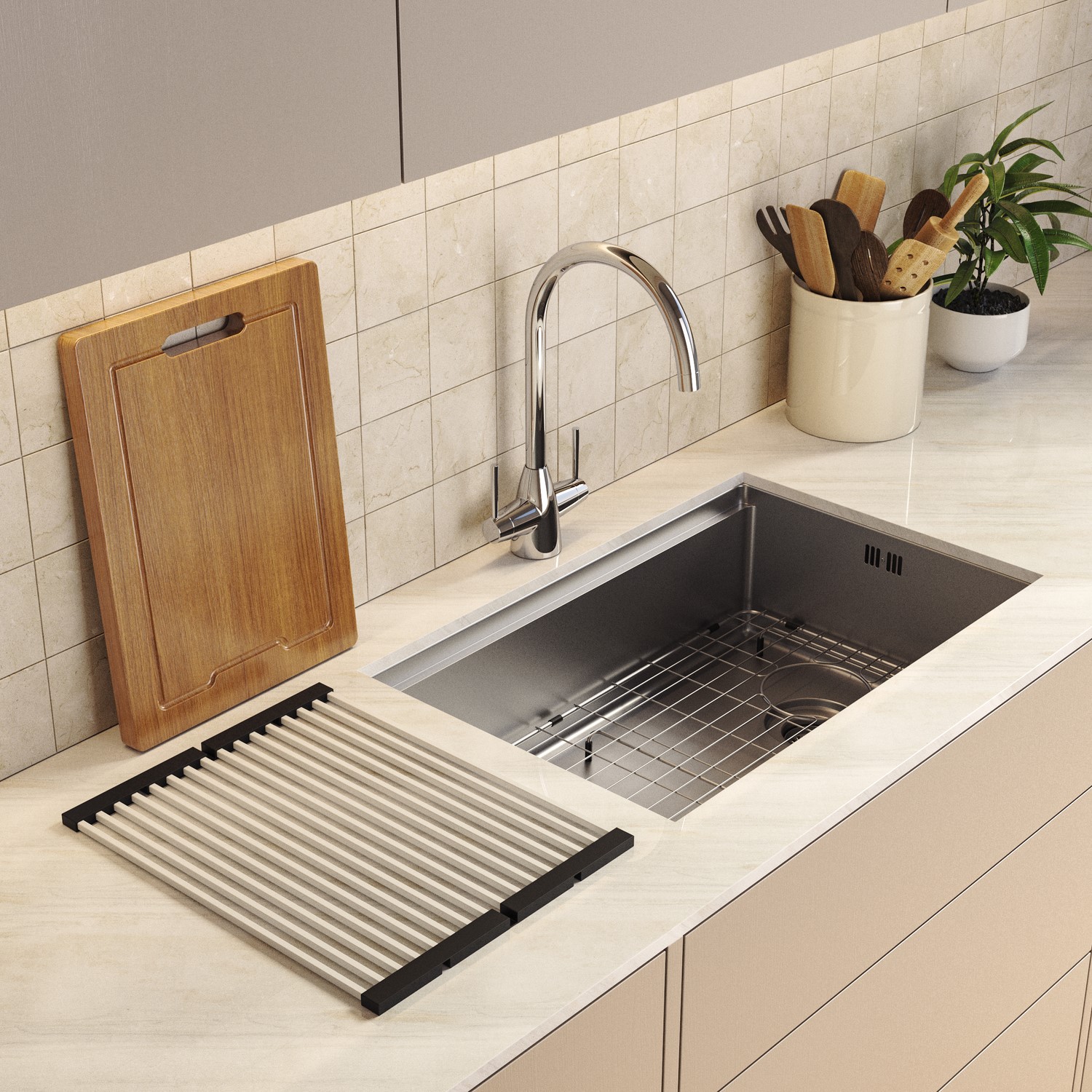 - Bamboo chopping board: Custom-sized to sit securely on the integrated ledge, creating a stable prep surface directly over the sink.