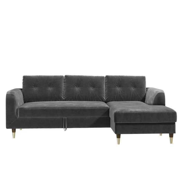 This Sutton sofa bed with modern styling makes a gorgeous addition to any living space. Beautifully upholstered in grey velvet with stylish button detailing and contrasting dark wood legs with gold tips, it's sure to make an impact. It's simple to turn to bed mode, pull the tab up to lift the seat, pull the bed out, and rest on the pull-out legs. It's perfect for last-minute sleepovers, so you'll always be ready when guests call and stay overnight at a moment's notice. Why not set it up for extra lounging space for those lazy evenings watching TV? It comes available with the chaise as left-hand facing and in other colourways.