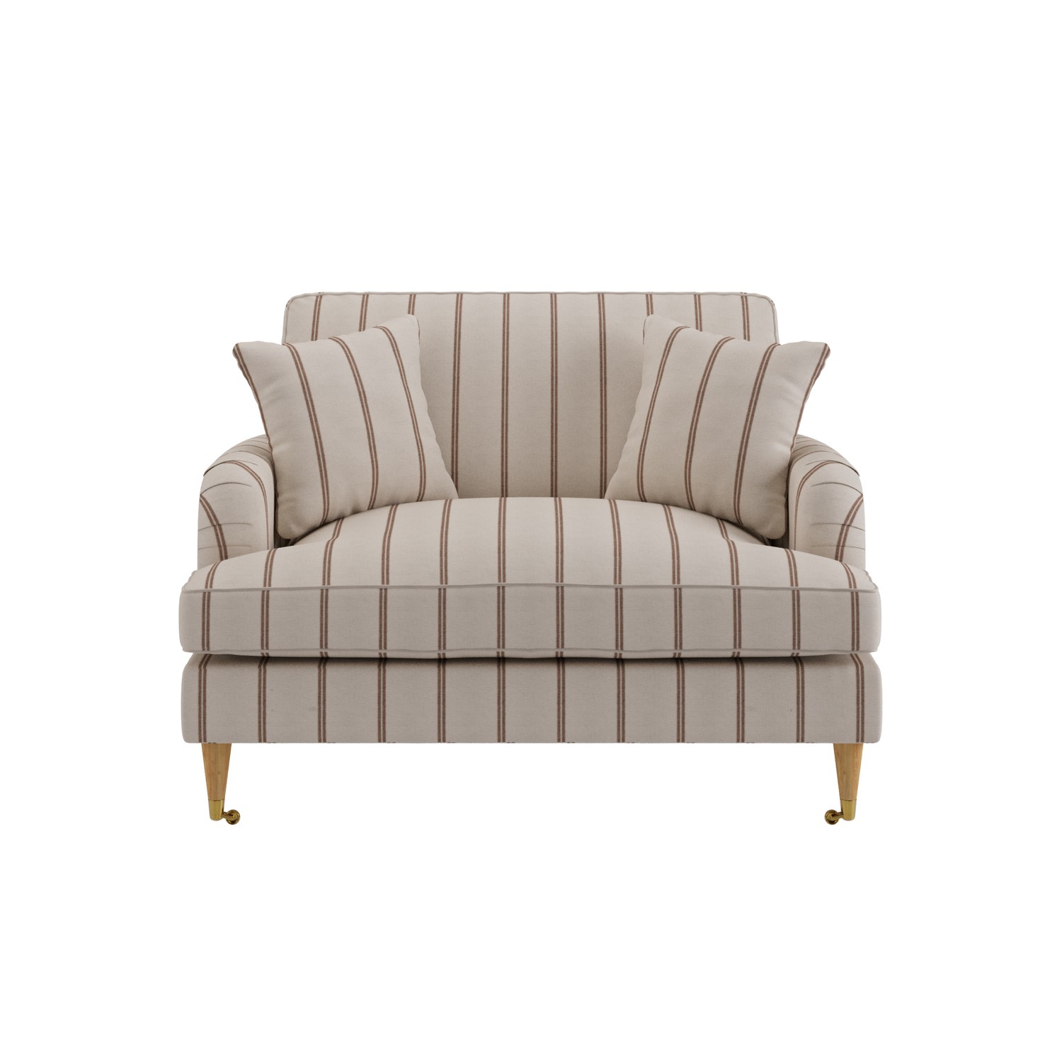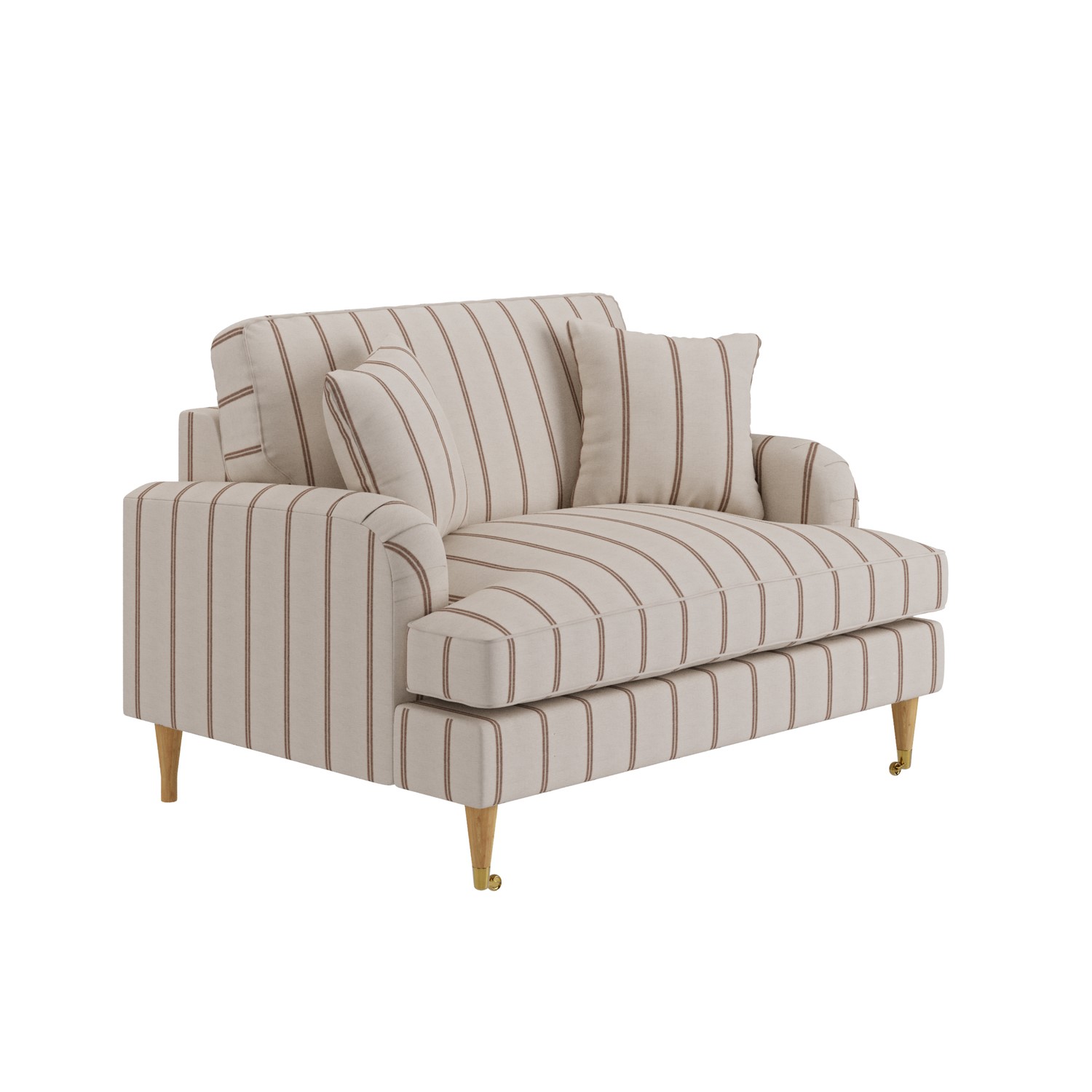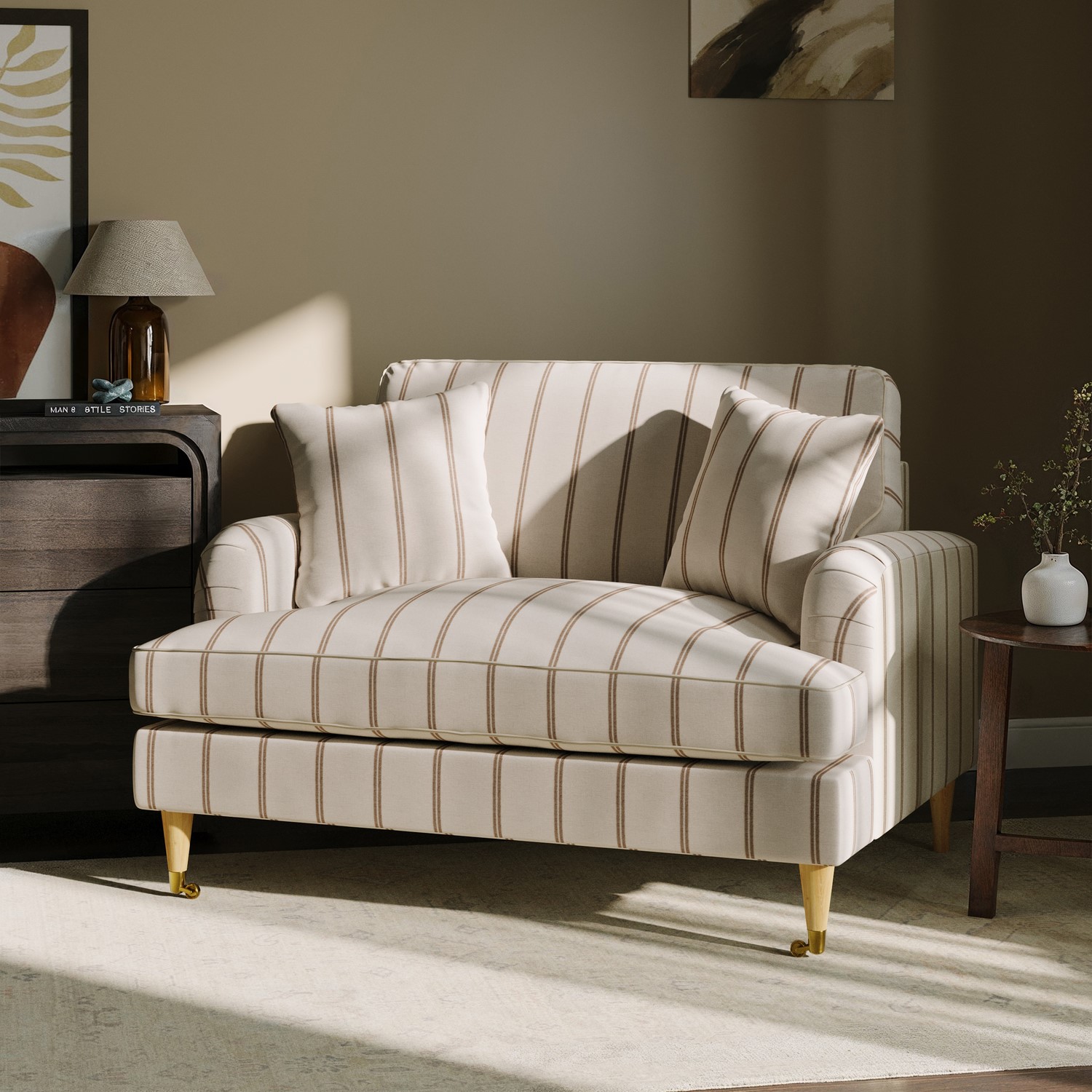The ultimate snuggle spot: Sink into comfort with the Payton Cream with Burnt Orange Stripe Love Seat. Designed for two, this spacious cuddle chair is perfect for cosy nights in, whether you’re relaxing alone or cuddling up with a loved one.