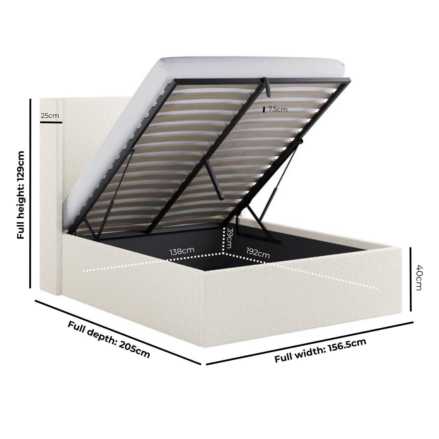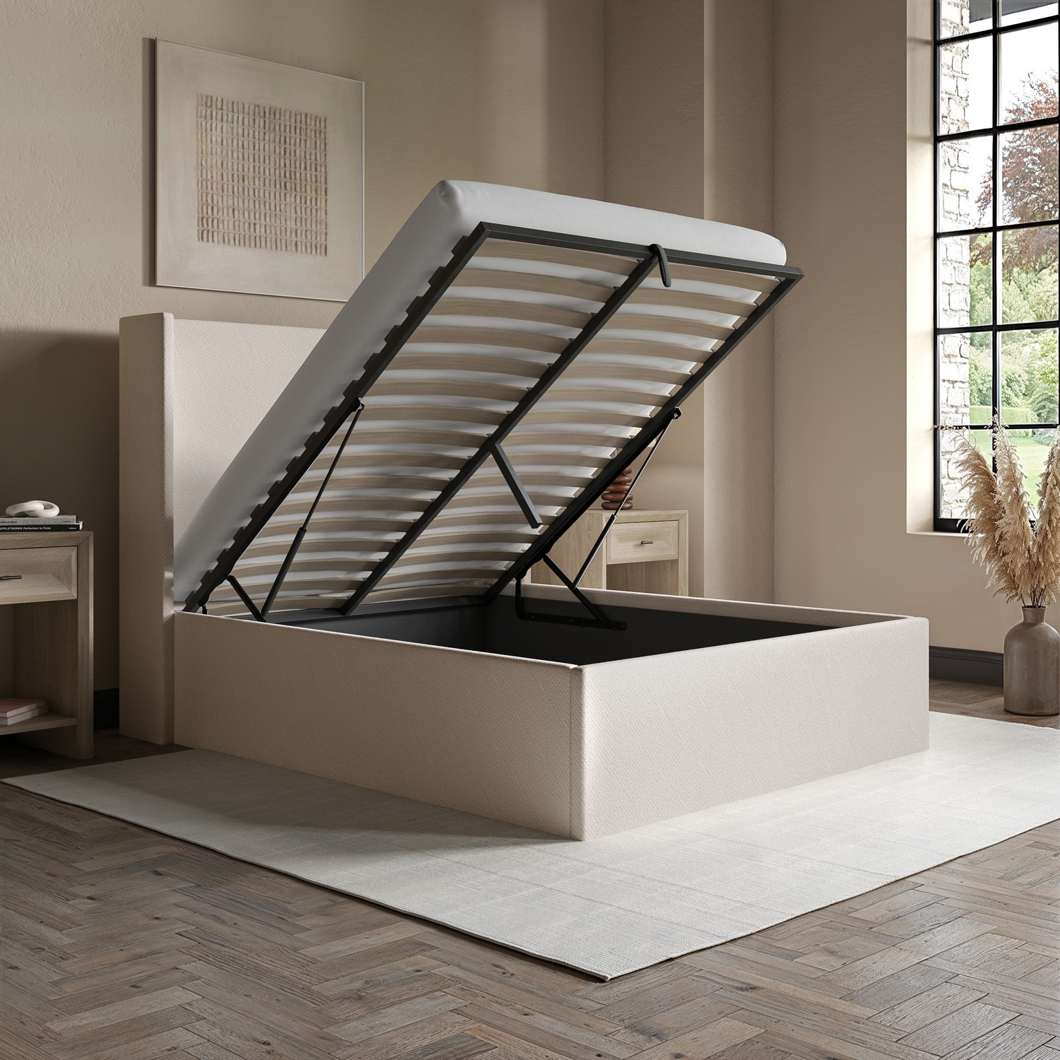 The Loxley Ottoman Bed is the ultimate blend of minimalist design and everyday practicality. Upholstered in soft, neutral cream textured fabric, it brings modern elegance that suits any decor style. The tall padded wingback headboard provides both comfort and a sophisticated focal point, while the smooth gas-lift mechanism reveals a spacious fabric-lined ottoman storage base, ideal for keeping your room clutter-free and your belongings neatly protected. It features a sprung slatted base for flexible mattress support and improved airflow, providing a cooler, more comfortable sleep. This bed is designed to fit a UK standard double-size mattress, which is not included, allowing you the freedom to pair it with a mattress of your choice.